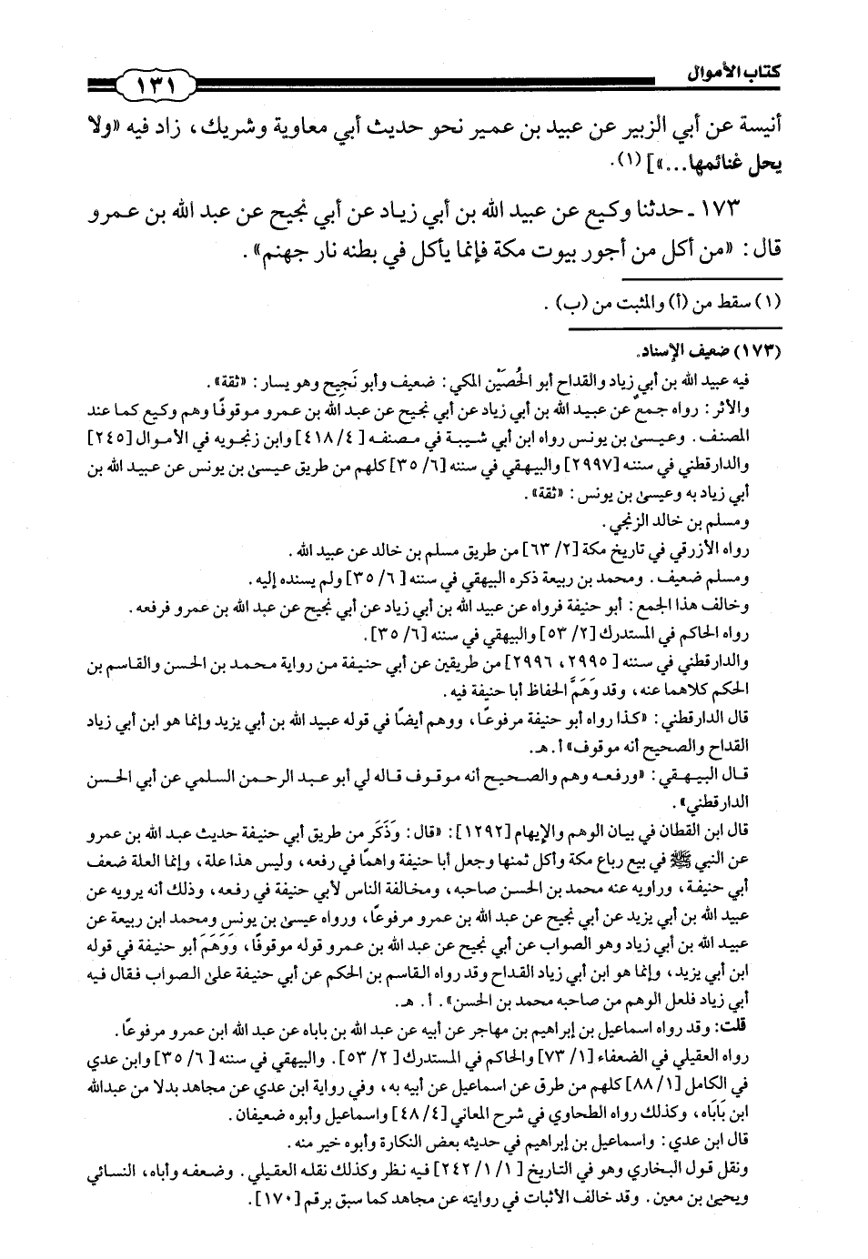 173 - (163) حَدَّثَنَا وَكِيعٌ، عَنْ عُبَيْدِ اللَّهِ بْنِ أَبِي زِيَادٍ، عَنْ أَبِي نَجِيحٍ، عَنْ عَبْدِ اللَّهِ بْنِ عَمْرٍو، قَالَ: «مَنْ أَكَلَ مِنْ أُجُورِ بُيُوتِ مَكَّةَ فَإِنَّمَا يَاكُلُ فِي بَطْنِهِ نَارَ جَهَنَّمَ».