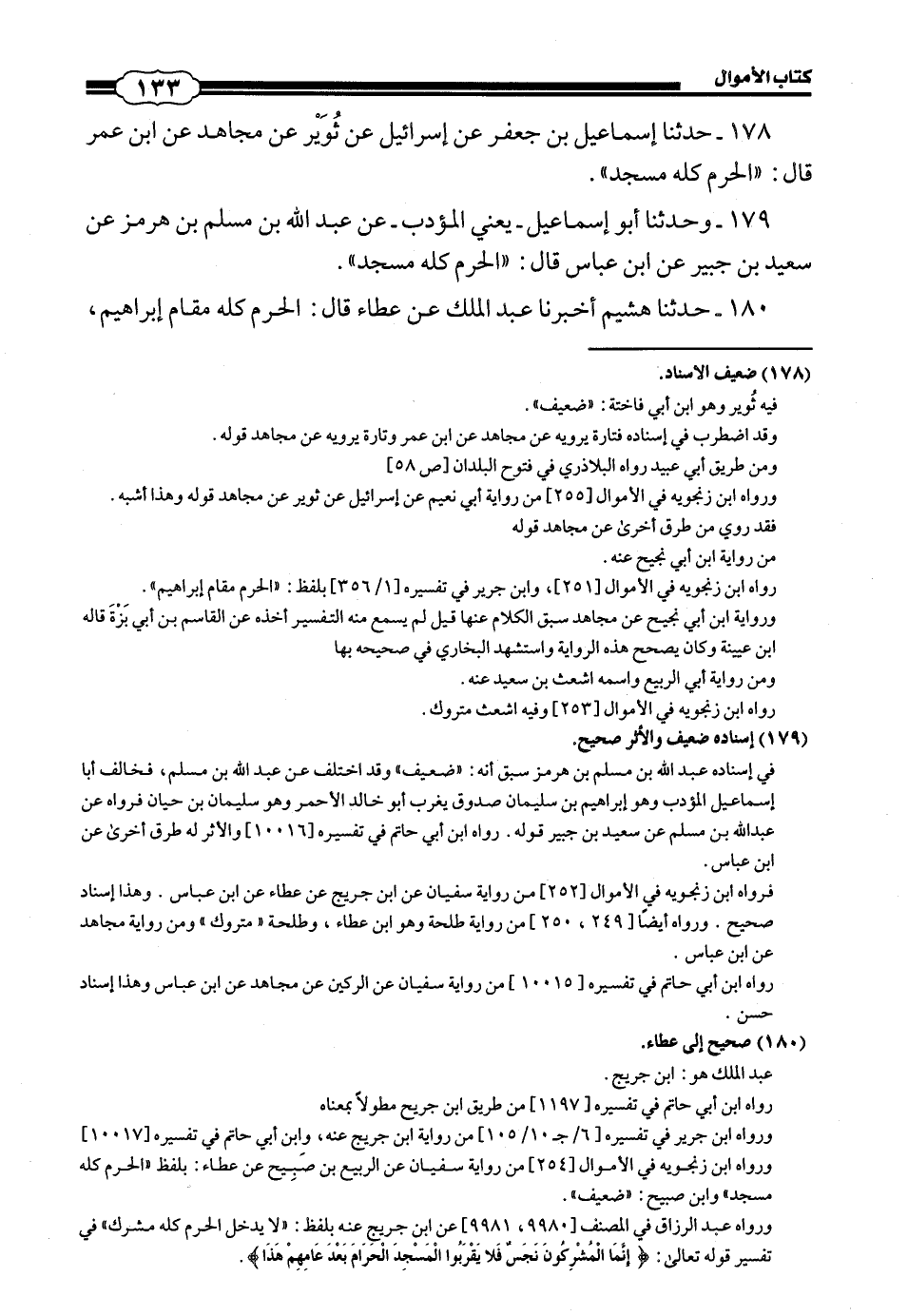 179 - وَحَدَّثَنَا أَبُو إِسْمَاعِيلَ يَعْنِي الْمُؤَدِّبَ، عَنْ عَبْدِ اللَّهِ بْنِ مُسْلِمِ بْنِ هُرْمُزَ، عَنْ سَعِيدِ بْنِ جُبَيْرٍ، عَنِ ابْنِ عَبَّاسٍ، قَالَ: «الْحَرَمُ كُلُّهُ مَسْجِدٌ».