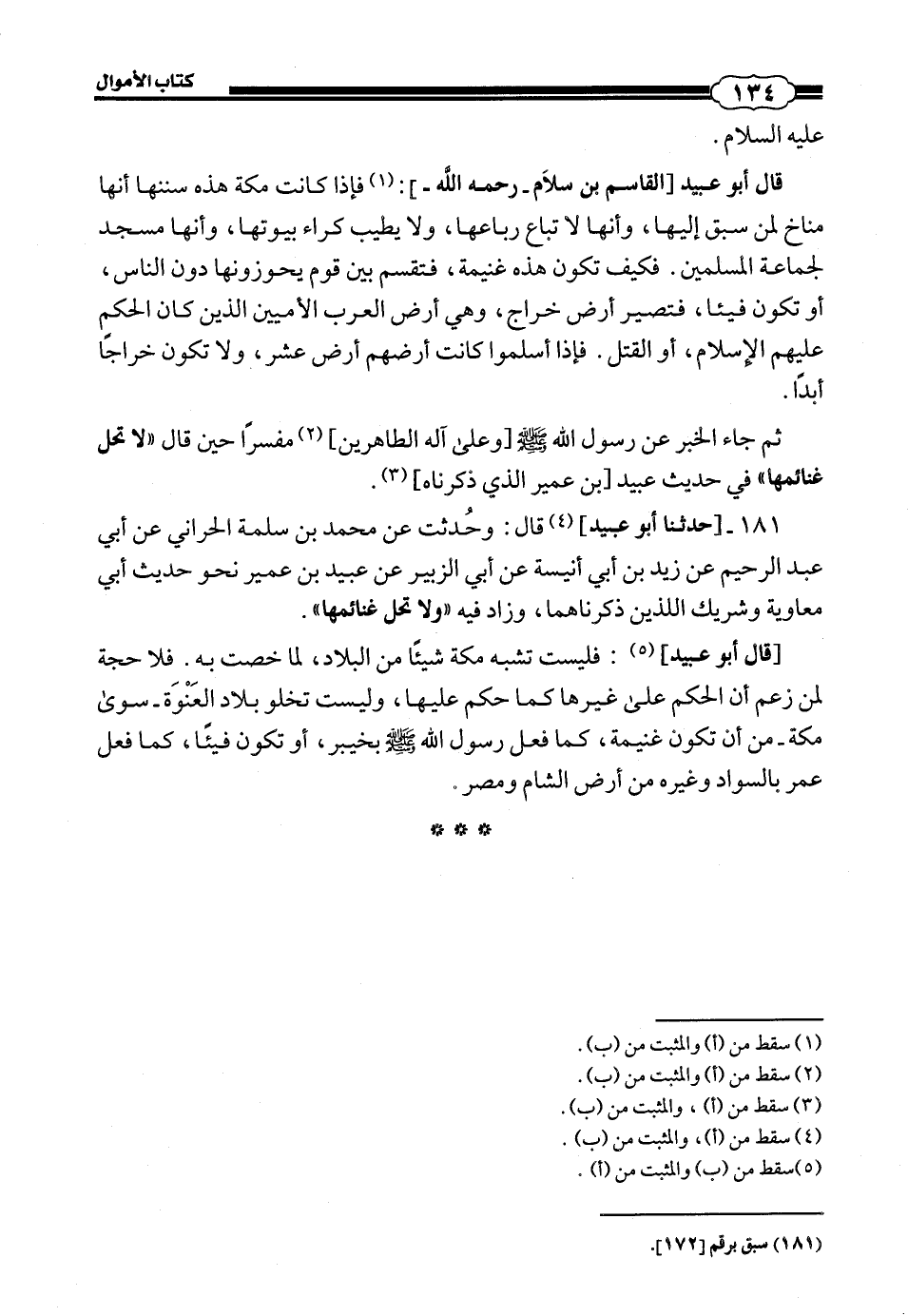 قَالَ أَبُو عُبَيْدٍ الْقَاسِمُ بْنُ سَلَّامٍ رَحِمَهُ اللَّهُ: فَإِذَا كَانَتْ مَكَّةُ هَذِهِ سُنَنُهَا أَنَّهَا مُنَاخٌ لِمَنْ سَبَقَ إِلَيْهَا، وَأَنَّهَا لَا تُبَاعُ رِبَاعُهَا، وَلَا يَطِيبُ كِرَاءُ بُيُوتِهَا، وَأَنَّهَا مَسْجِدٌ لِجَمَاعَةِ الْمُسْلِمِينَ، فَكَيْفَ تَكُونُ هَذِهِ غَنِيمَةً، فَتُقْسَمُ بَيْنَ قَوْمٍ يَحُوزُونَهَا دُونَ النَّاسِ، أَوْ تَكُونُ فَيْئًا فَتَصِيرُ أَرْضَ خَرَاجٍ، وَهِيَ أَرْض الْعَرَبِ الْأُمِّيِّينَ الَّذِينَ كَانَ الْحُكْمُ عَلَيْهِمُ الْإِسْلَامُ، أَوِ الْقَتْلُ فَإِذَا أَسْلَمُوا كَانَتْ أَرْضُهُمْ أَرْضَ عُشْرٍ، وَلَا تَكُونُ خَرَاجًا أَبَدًا؟ ثُمَّ جَاءَ الْخَبَرُ عَنْ رَسُولِ اللَّهِ صَلَّى اللهُ عَلَيْهِ وَسَلَّمَ وَعَلَى آلِهِ الطَّاهِرِينَ مُفَسِّرًا حِينَ قَالَ: لَا تَحِلُّ غَنَائِمُهَا فِي حَدِيثِ عُبَيْدِ بْنِ عُمَيْرٍ الَّذِي ذَكَرْنَاهُ.