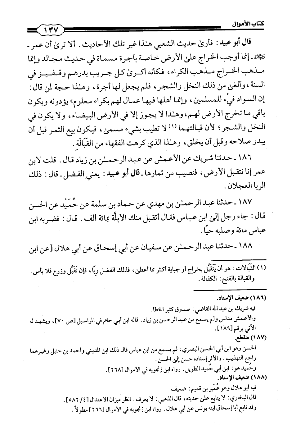 186 - (176) حَدَّثَنَا شَرِيكٌ، عَنِ الْأَعْمَشِ، عَنْ عَبْدِ الرَّحْمَنِ بْنِ زِيَادٍ، قَالَ: قُلْتُ لِابْنِ عُمَرَ إِنَّا نَتَقَبَّلُ الْأَرْضَ فَنُصِيبُ مِنْ ثِمَارِهَا، قَالَ أَبُو عُبَيْدٍ: - يَعْنِي: الْفَضْلَ - قَالَ: ذَلِكَ الرِّبَا الْعَجْلَانُ.