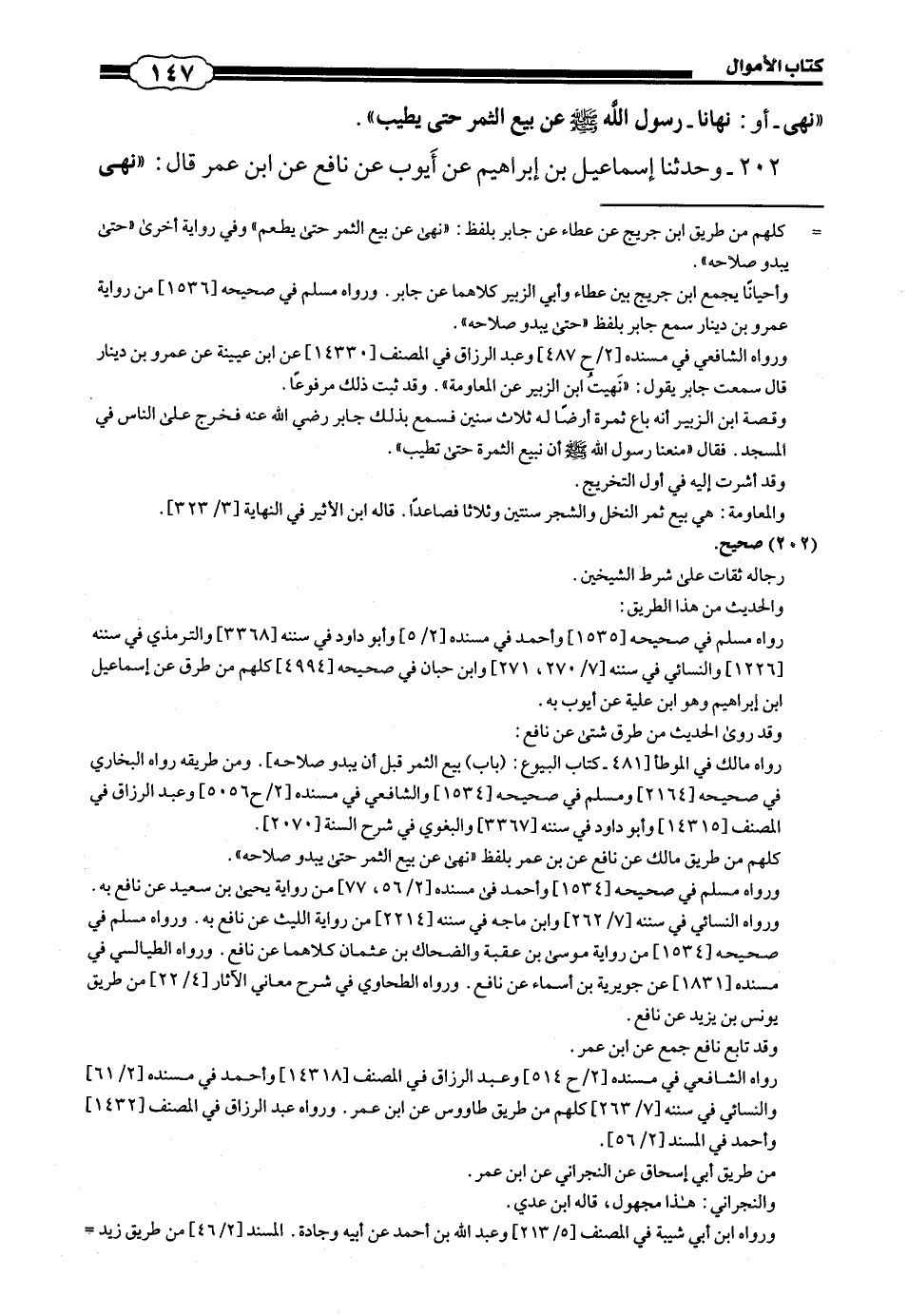 202 - (187) وَحَدَّثَنَا إِسْمَاعِيلُ بنْ إِبْرَاهِيمَ، عَنْ أَيُّوبَ، عَنْ نَافِعٍ، عَنِ ابْنِ عُمَرَ، قَالَ: " نَهَى #148# الرَّسُولُ صَلَّى اللهُ عَلَيْهِ وَسَلَّمَ عَنْ بَيْعِ ثَمَرِ النَّخِيلِ حَتَّى يَزْهُوَ، وَعَنْ بَيْعِ السُّنْبُلِ حَتَّى يَبْيَضَّ وَيَامَنَ مِنَ الْعَاهَةِ: نَهَى الْبَائِعَ وَنَهَى الْمُشْتَرِيَ ".