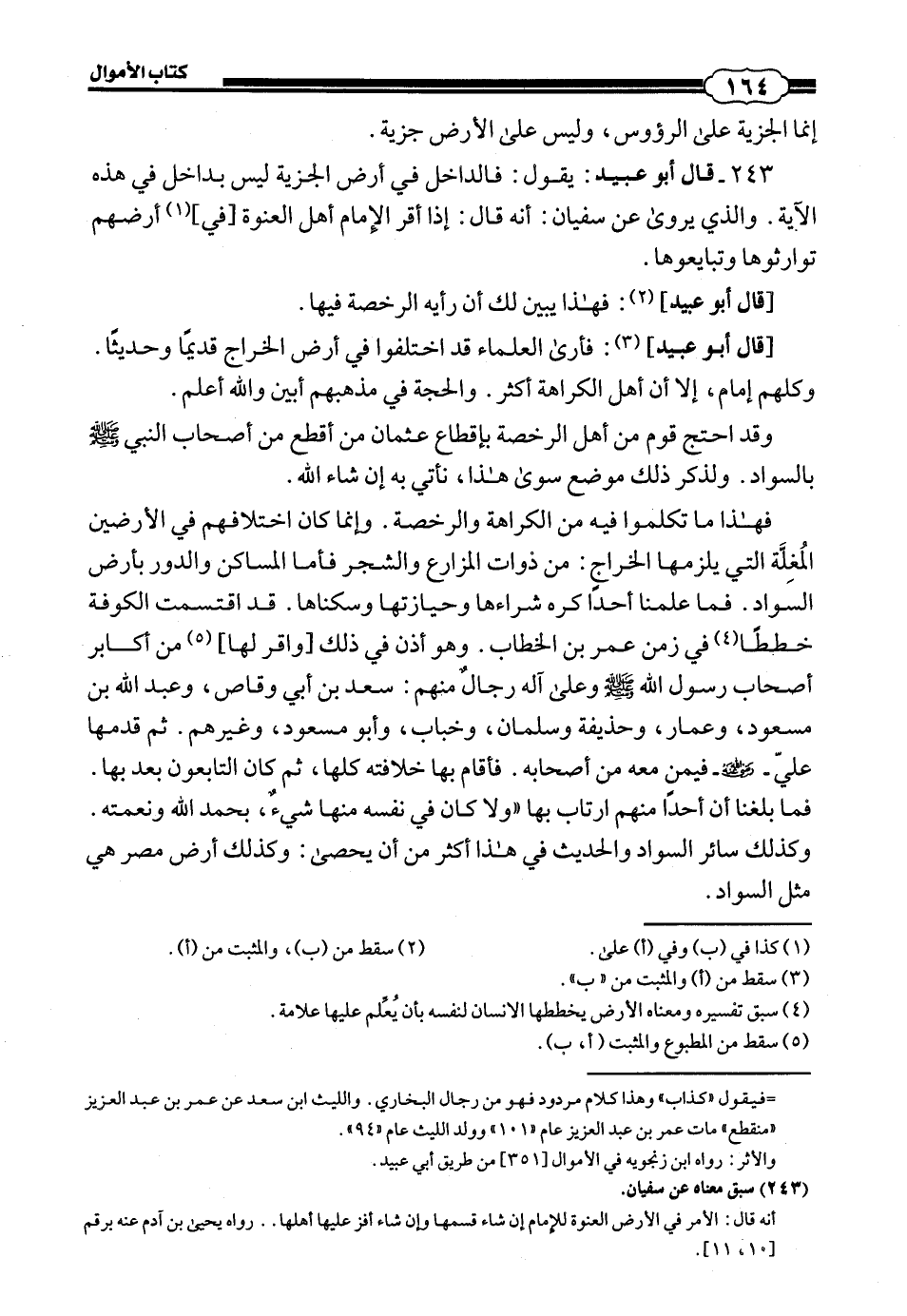 قَالَ أَبُو عُبَيْدٍ: فَهَذَا يُبَيِّنُ لَكَ أَنَّ رَايَهُ الرُّخْصَةُ فِيهَا. قَالَ أَبُو عُبَيْدٍ: فَأَرَى الْعُلَمَاءَ قَدِ اخْتَلَفُوا فِي أَرْضِ الْخَرَاجِ قَدِيمًا وَحَدِيثًا، وَكُلُّهُمْ إِمَامٌ، إِلَّا أَنَّ أَهْلَ الْكَرَاهَةِ أَكْثَرُ، وَالْحُجَّةُ فِي مَذْهَبِهِمْ أَبْيَنُ، وَاللَّهُ أَعْلَمُ. وَقَدِ احْتَجَّ قَوْمٌ مِنْ أَهْلِ الرُّخْصَةِ بِإِقْطَاعِ عُثْمَانَ مَنْ أَقْطَعَ مِنْ أَصْحَابِ النَّبِيِّ صَلَّى اللهُ عَلَيْهِ وَسَلَّمَ بِالسَّوَادِ وَلِذِكْرِ ذَلِكَ مَوْضِعٌ سِوَى هَذَا، نَاتِي بِهِ إِنْ شَاءَ اللَّهُ. فَهَذَا مَا تَكَلَّمُوا فِيهِ مِنَ الْكَرَاهَةِ وَالرُّخْصَةِ، وَإِنَّمَا كَانَ اخْتِلَافُهُمْ فِي الْأَرَضِينَ الْمُغَلَّةِ الَّتِي يَلْزَمُهَا الْخَرَاجُ: مِنْ ذَوَاتِ الْمَزَارِعِ وَالشَّجَرِ، فَأَمَّا الْمَسَاكِنُ وَالدُّورُ بِأَرْضِ السَّوَادِ فَمَا عَلِمْنَا أَحَدًا كَرِهَ شِرَاءَهَا وَحِيَازَتَهَا وَسُكْنَاهَا، قَدِ اقْتُسِمَتِ الْكُوفَةُ خُطَطًا فِي زَمَنِ عُمَرَ بْنِ الْخَطَّابِ، وَهُوَ أَذِنَ فِي ذَلِكَ وأقر لها مِنْ أكَابِرِ أَصْحَابِ رَسُولِ اللَّهِ صَلَّى اللهُ عَلَيْهِ وَسَلَّمَ وَعَلَى آلِهِ رِجَالٌ: مِنْهُمْ سَعْدُ بْنُ أَبِي وَقَّاصٍ، وَعَبْدُ اللَّهِ بْنُ مَسْعُودٍ، وَعَمَّارٌ، وَحُذَيْفَةُ، وَسَلْمَانُ، وَخَبَّابٌ، وَأَبُو مَسْعُودٍ، وَغَيْرُهُمْ ثُمَّ قَدِمَهَا عَلِيُّ رَضِيَ اللَّهُ عَنْهُ فِيمَنْ مَعَهُ مِنْ أَصْحَابِهِ، فَأَقَامَ بِهَا خِلَافَتَهُ كُلَّهَا، ثُمَّ كَانَ التَّابِعُونَ بَعْدُ بِهَا، فَمَا بَلَغَنَا أَنَّ أَحَدًا مِنْهُمُ ارْتَابَ بِهَا، وَلَا كَانَ فِي نَفْسِهِ مِنْهَا شَيْءٌ، بِحَمْدِ اللَّهِ وَنِعْمَتِهِ، وَكَذَلِكَ سَائِرُ السَّوَادِ، وَالْحَدِيثُ فِي هَذَا أَكْثَرُ مِنْ أَنْ يُحْصَى، وَكَذَلِكَ أَرْضُ مِصْرَ هِيَ مِثْلُ السَّوَادِ.
