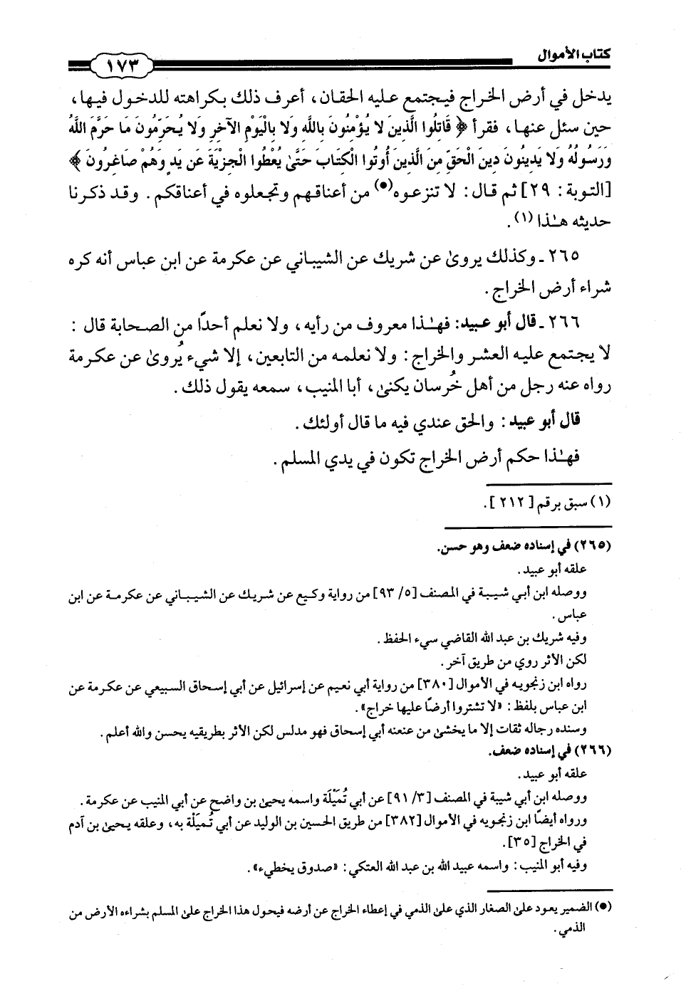 266 - قَالَ أَبُو عُبَيْدٍ: فَهَذَا مَعْرُوفٌ مِنْ رَايِهِ، وَلَا نَعْلَمُ أَحَدًا مِنَ الصَّحَابَةِ، قَالَ: لَا يَجْتَمِعُ عَلَيْهِ الْعُشْرُ وَالْخَرَاجُ، وَلَا نَعْلَمُهُ مِنَ التَّابِعِينَ، إِلَّا شَيْءٌ يُرْوَى عَنْ عِكْرِمَةَ رَوَاهُ عَنْهُ رَجُلٌ مِنْ أَهْلِ خُرَاسَانَ يُكْنَى أَبَا الْمُنِيبِ، سَمِعَهُ يَقُولُ ذَلِكَ.