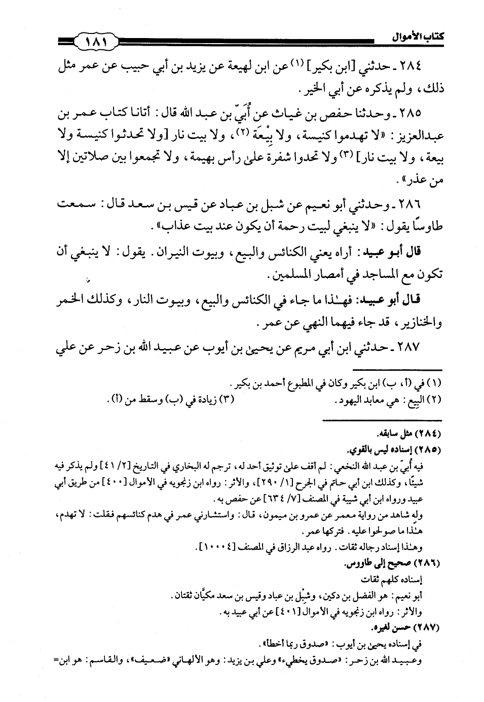 285 - (262) وَحَدَّثَنَا حَفْصُ بْنُ غِيَاثٍ، عَنْ أُبَيِّ بْنِ عَبْدِ اللَّهِ، قَالَ: أَتَانَا كِتَابُ عُمَرَ بْنِ عَبْدِ الْعَزِيزِ: «لَا تَهْدِمُوا كَنِيسَةً وَلَا بَيْعَةً وَلَا بَيْتَ نَارٍ، وَلَا تُحْدِثُوا كَنِيسَةً وَلَا بَيْعَةً وَلَا بَيْتَ نَارٍ، وَلَا تُحِدُّوا شَفْرَةً عَلَى رَاسِ بَهِيمَةٍ، وَلَا تَجْمَعُوا بَيْنَ صَلَاتَيْنِ إِلَّا مِنْ عُذْرٍ».