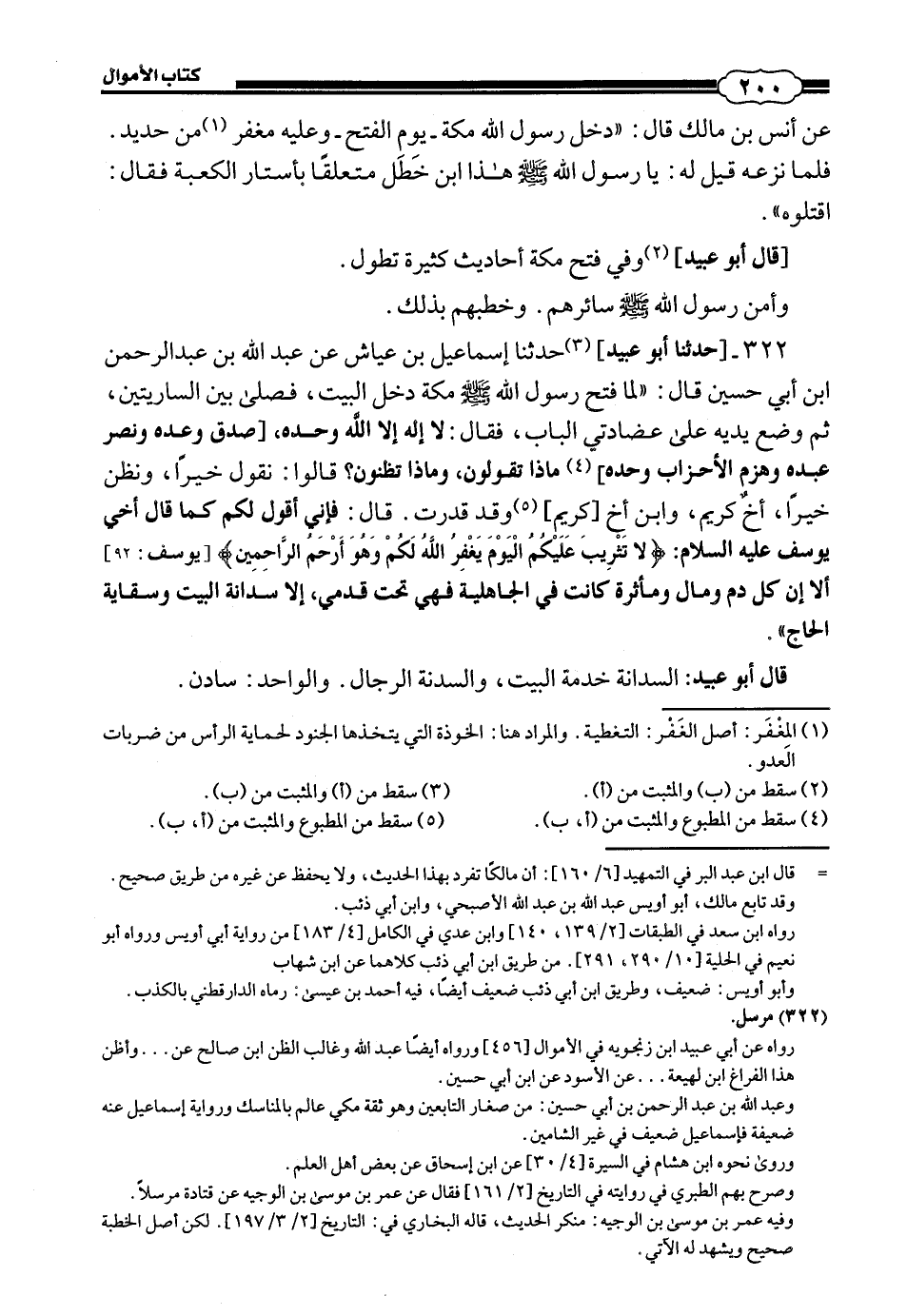 322 - (298) حَدَّثَنَا أَبُو عُبَيْدٍ حَدَّثَنَا إِسْمَاعِيلُ بْنُ عَيَّاشٍ، عَنْ عَبْدِ اللَّهِ بْنِ عَبْدِ الرَّحْمَنِ بْنِ أَبِي حُسَيْنٍ، قَالَ: لَمَّا فَتَحَ رَسُولُ اللَّهِ صَلَّى اللهُ عَلَيْهِ وَسَلَّمَ مَكَّةَ دَخَلَ الْبَيْتَ، فَصَلَّى بَيْنَ السَّارِيَتَيْنِ، ثُمَّ وَضَعَ يَدَيْهِ عَلَى عِضَادَتَيِ الْبَابِ، فَقَالَ: «لَا إِلَهَ إِلَّا اللَّهُ وَحْدَهُ، صدق وعده ونصر عبده وهزم الأحزاب وحده، مَاذَا تَقُولُونَ، وَمَاذَا تَظُنُّونَ؟» قَالُوا: نَقُولُ خَيْرًا، وَنَظُنُّ خَيْرًا: أَخٌ كَرِيمٌ، وَابْنُ أَخٍ كريم، وَقَدْ قَدَرْتَ، قَالَ: " فَإِنِّي أَقُولُ لَكُمْ كَمَا قَالَ أَخِي يُوسُفُ عليه السلام: {لَا تَثْرِيبَ عَلَيْكُمُ الْيَوْمَ يَغْفِرُ اللَّهُ لَكُمْ وَهُوَ أَرْحَمُ الرَّاحِمِينَ} [يوسف: 92] أَلَا إِنَّ كُلَّ دَمٍ وَمَالٍ وَمَاثُرَةٍ كَانَتْ فِي الْجَاهِلِيَّةِ فَهِيَ تَحْتَ قَدَمَيَّ، إِلَّا سِدَانَةَ الْبَيْتِ وَسِقَايَةَ الْحَاجِّ ".