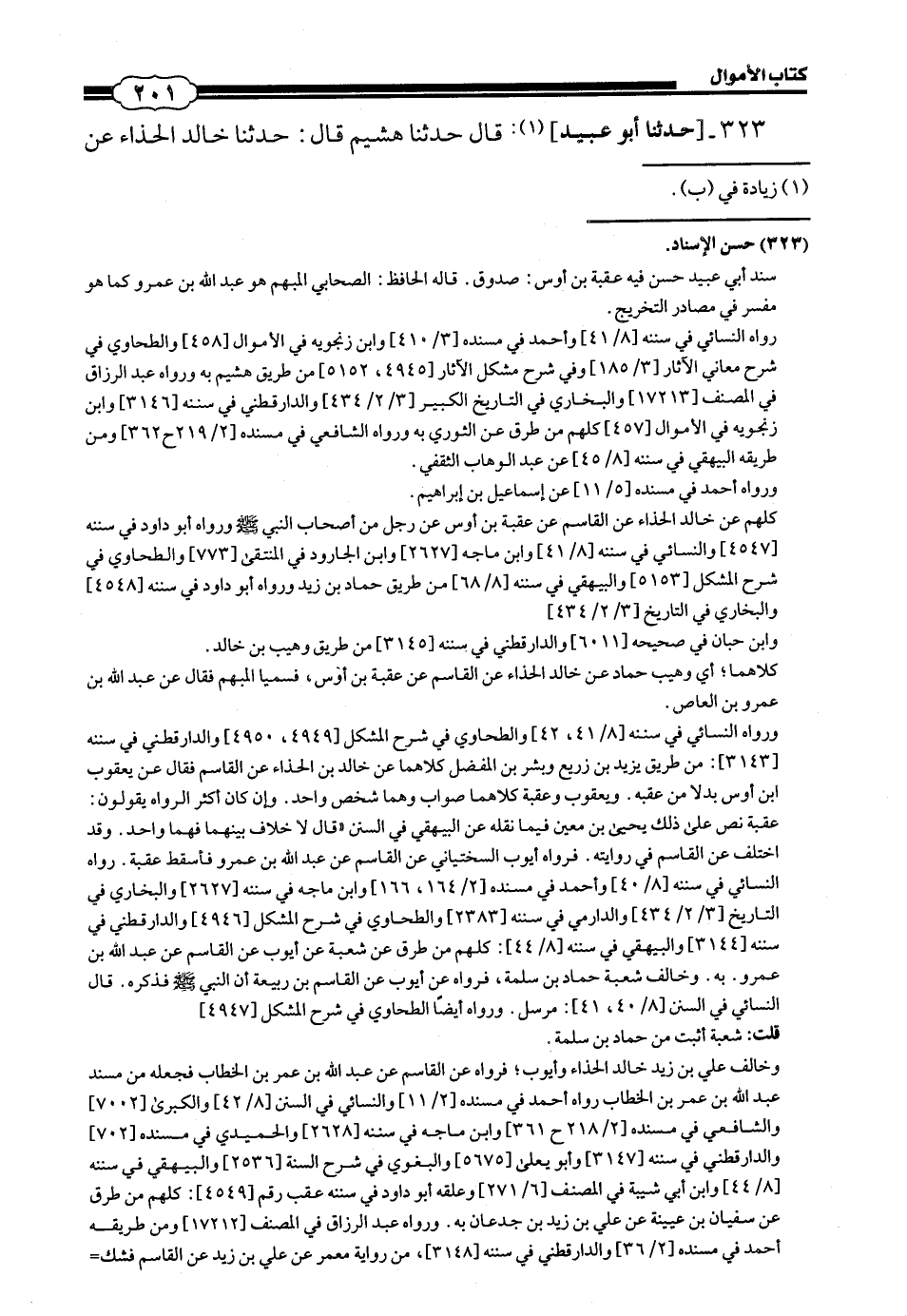 323 - (299) حَدَّثَنَا أَبُو عُبَيْدٍ قَالَ: حَدَّثَنَا هُشَيْمٌ، قَالَ: حَدَّثَنَا خَالِدٌ الْحَذَّاءُ، عَنِ #202# الْقَاسِمِ بْنِ رَبِيعَةَ، عَنْ عُقْبَةَ بْنِ أَوْسٍ، عَنْ رَجُلٍ مِنْ أَصْحَابِ رَسُولِ اللَّهِ صَلَّى اللهُ عَلَيْهِ وَسَلَّمَ قَالَ: خَطَبَ رَسُولُ اللَّهِ صَلَّى اللهُ عَلَيْهِ وَسَلَّمَ يَوْمَ فَتْحِ مَكَّةَ، فَقَالَ: الْحَمْدُ لِلَّهِ الَّذِي صَدَقَ وَعْدَهُ، وَنَصَرَ عَبْدَهُ، وَهَزَمَ الْأَحْزَابَ وَحْدَهُ، أَلَا إِنَّ كُلَّ مَاثُرَةٍ كَانَتْ فِي الْجَاهِلِيَّةِ تَعُدُّ أَوْ تُدْعَى، وَكُلَّ دَمٍ أَوْ دَعْوَى، مَوْضُوعَةٌ تَحْتَ قَدَمَيَّ هَاتَيْنِ، إِلَّا سِدَانَةَ الْبَيْتِ وَسِقَايَةَ الْحَاجِّ، أَلَا وَفِي قَتِيلِ خَطَأِ الْعَمْدِ بِالسَّوْطِ وَالْعَصَا وَالْحَجَرِ مِائَةٌ مِنَ الْإِبِلِ، مِنْهَا أَرْبَعُونَ مَا بَيْنَ ثَنِيَّةٍ إِلَى بَازِلِ عَامِهَا كُلُّهَا خَلِفَةٌ.