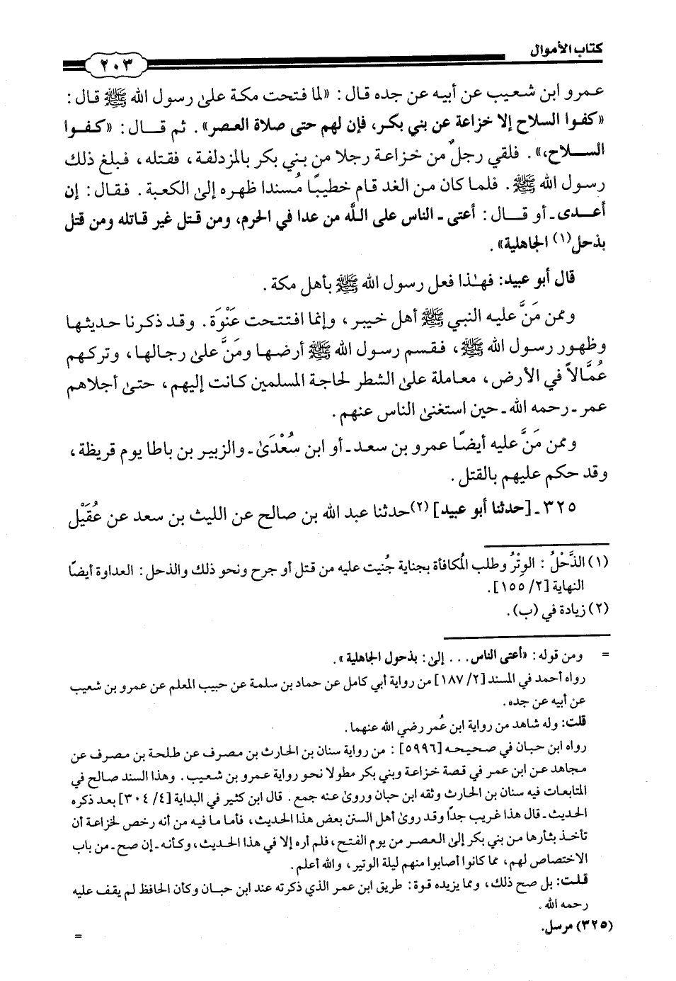 325 - (301) حَدَّثَنَا أَبُو عُبَيْدٍ حَدَّثَنَا عَبْدُ اللَّهِ بْنُ صَالِحٍ، عَنِ اللَّيْثِ بْنِ سَعْدٍ، عَنْ عُقَيْلٍ، #204# عَنِ ابْنِ شِهَابٍ، أَنَّ رَسُولَ اللَّهِ صَلَّى اللهُ عَلَيْهِ وَسَلَّمَ عَدَا إِلَى بَنِي قُرَيْظَةَ، فَحَاصَرَهُمْ، حَتَّى نَزَلُوا عَلَى حُكْمِ سَعْدِ بْنِ مُعَاذٍ فَقَضَى بِأَنْ تُقْتَلَ رِجَالُهُمْ وَتُقْسَمَ ذَرَارِيُّهُمْ وَأَمْوَالُهُمْ، فَقُتِلَ مِنْهُمْ يَوْمَئِذٍ كَذَا وَكَذَا رَجُلًا، إِلَّا عَمْرَو بْنَ سَعْدٍ أَوِ ابْنَ سُعْدَى قَالَ رَسُولُ اللَّهِ صَلَّى اللهُ عَلَيْهِ وَسَلَّمَ: «إِنَّهُ كَانَ يَامُرُ بِالْوَفَاءِ وَيَنْهَى عَنِ الْغَدْرِ»؛ فَلِذَلِكَ نَجَا - قَالَ: وَبَعْضُهُمْ يَقُولُ عَمْرُو بْنُ سُعْدَى وَأُرَاهَا أُمَّهُ -. قَالَ: وَدَفَعَ رَسُولُ اللَّهِ صَلَّى اللهُ عَلَيْهِ وَسَلَّمَ الزُّبَيْرَ إِلَى ثَابِتِ بْنِ قَيْسِ بْنِ شَمَّاسٍ، فَأَعْتَقَهُ، وَكَانَ الزُّبَيْرُ أَجَارَهُ يَوْمَ بُعَاثٍ، فَقَالَ ثَابِتٌ لِلزُّبَيْرِ: أَجْزِيكَ بِيَوْمِ بُعَاثٍ، فَقَالَ الزُّبَيْرُ أَعِيشُ بِغَيْرِ أَهْلٍ وَلَا مَالٍ؟ فَقَالَ رَسُولُ اللَّهِ صَلَّى اللهُ عَلَيْهِ وَسَلَّمَ: لَهُ أَهْلُهُ وَمَالُهُ إِنْ أَسْلَمَ فَقَالَ ثَابِتٌ لِلزُّبَيْرِ: قَدْ رَدَّ إِلَيْكَ رَسُولُ اللَّهِ صَلَّى اللهُ عَلَيْهِ وَسَلَّمَ مَالَكَ وَأَهْلَكَ، فَقَالَ الزُّبَيْرُ: مَا فَعَلَ كَعْبُ بْنُ أَسَدٍ، وَأَبُو نَافِعٍ، وَأَبُو يَاسِرٍ، وَابْنُ أَبِي الْحُقَيْقِ؟ قَالَ: قُتِلُوا، فَقَالَ الزُّبَيْرُ: أَعِيشُ فِي النَّادِي وَلَا أَرَى مِنْهُمْ أَحَدًا، وَلَا أَصْبِرُ عَنْهُمْ إِفْرَاغَ دَلْو، خُذْ سَيْفًا صَارِمًا، ثُمَّ ارْفَعْ سَيْفَكَ عَنِ الطَّعَامِ، قَدْ بَرِئَتْ مِنِّي ذِمَّتُكَ، قَالَ: فَدُفِعَ إِلَى مُحَيِّصَةَ أَخِي بَنِي حَارِثَةَ فَقَتَلَهُ.