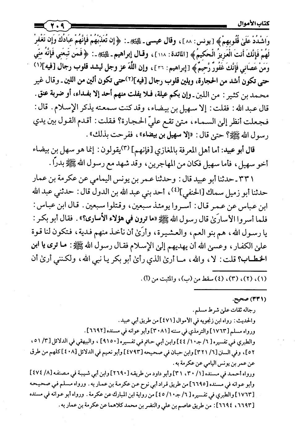 331 - (307) حَدَّثَنَا أَبُو عُبَيْدٍ قَالَ: وَحَدَّثَنَا عُمَرُ بْنُ يُونُسَ الْيَمَامِيُّ، عَنْ عِكْرِمَةَ بْنِ عَمَّارٍ، حَدَّثَنَا أَبُو زُمَيْلٍ سِمَاكٌ الْحَنَفِيُّ، أَحَدُ بَنِي عَبْدِ اللَّهِ بْنِ الدُّولِ، قَالَ: حَدَّثَنِي عَبْدُ اللَّهِ بْنُ عَبَّاسٍ، عَنْ عُمَرَ، قَالَ: أَسَرُوا يَوْمَئِذٍ سَبْعِينَ، وَقَتَلُوا سَبْعِينَ. قَالَ ابْنُ عَبَّاسٍ: فَلَمَّا أَسَرُوا الْأُسَارَى قَالَ رَسُولُ اللَّهِ صَلَّى اللهُ عَلَيْهِ وَسَلَّمَ مَا تَرَوْنَ فِي هَؤُلَاءِ الْأُسَارَى؟ فَقَالَ أَبُو بَكْرٍ: يَا رَسُولَ اللَّهِ، هُمْ بَنُو الْعَمِّ، وَالْعَشِيرَةِ، وَأَرَى أَنْ نَاخُذَ مِنْهُمْ فِدْيَةً، فَتَكُونُ لَنَا قُوَّةٌ عَلَى الْكُفَّارِ، وَعَسَى اللَّهُ أَنْ يَهْدِيَهُمْ إِلَى الْإِسْلَامِ فَقَالَ رَسُولُ اللَّهِ صَلَّى اللهُ عَلَيْهِ وَسَلَّمَ: مَا تَرَى يَا ابْنَ الْخَطَّابِ؟ قُلْتُ: لَا وَاللَّهِ، مَا أَرَى الَّذِي رَأَى أَبُو بَكْرٍ يَا نَبِيَّ اللَّهِ، وَلَكِنَّنِي أَرَى أَنْ #210# تُمَكِّنَنَا مِنْهُمْ، فَنَضْرِبَ أَعْنَاقَهُمْ، فَتُمَكِّنَ عَلِيًّا مِنْ عَقِيلٍ، فَيَضْرِبَ عُنُقَهُ، وَتُمَكِّنَنِي مِنْ فُلَانٍ - نَسِيبٍ لِعُمَرَ - فَأَضْرِبَ عُنُقَهُ فَإِنَّ هَؤُلَاءِ أَئِمَّةُ الْكُفْرِ، وَصَنَادِيدُهُ، قَالَ فَهَوَي رَسُولُ اللَّهِ صَلَّى اللهُ عَلَيْهِ وَسَلَّمَ مَا قَالَ أَبُو بَكْرٍ، لَمْ يَهْوَ مَا قُلْتُ، فَلَمَّا كَانَ مِنَ الْغَدِ جِئْتُ إِلَى رَسُولِ اللَّهِ صَلَّى اللهُ عَلَيْهِ وَسَلَّمَ وَأَبِي بَكْرٍ قَاعِدَيْنِ يَبْكِيَانِ، فَقُلْتُ: يَا رَسُولَ اللَّهِ، أَخْبِرْنِي: مِنْ أَيِّ شَيْءٍ تَبْكِي أَنْتَ وَصَاحِبُكَ، فَإِنْ وَجَدْتُ بُكَاءً بَكَيْتُ، وَأَنْ لَمْ أَجِدْ بُكَاءً تَبَاكَيْتُ لِبُكَائِكُمَا؟ فَقَالَ رَسُولُ اللَّهِ صَلَّى اللهُ عَلَيْهِ وَسَلَّمَ: أَبْكِي لِلَّذِي عَرَضَ عَلَيَّ أَصْحَابُكَ مِنْ أَخْذِهِمُ الْفِدَاءَ، وَلَقَدْ عُرِضَ عَلَيَّ عَذَابُكُمْ أَدْنَى مِنْ هَذِهِ الشَّجَرَةِ - شَجَرَةٍ قَرِيبَةٍ مِنْ نَبِيِّ اللَّهِ صَلَّى اللهُ عَلَيْهِ وَسَلَّمَ وَأَنْزَلَ اللَّهُ عَزَّ وَجَلَّ: {مَا كَانَ لِنَبِيٍّ أَنْ يَكُونَ لَهُ أَسْرَى حَتَّى يُثْخِنَ فِي الْأَرْضِ تُرِيدُونَ عَرَضَ الدُّنْيَا وَاللَّهُ يُرِيدُ الْآخِرَةَ وَاللَّهُ عَزِيزٌ حَكِيمٌ} {لَوْلَا كِتَابٌ مِنَ اللَّهِ سَبَقَ لَمَسَّكُمْ فِيمَا أَخَذْتُمْ عَذَابٌ عَظِيمٌ} {فَكُلُوا مِمَّا غَنِمْتُمْ حَلَالًا طَيِّبًا} [الأنفال: 68] فَأَحَلَّ اللَّهُ الْغَنِيمَةَ لَهُمْ.