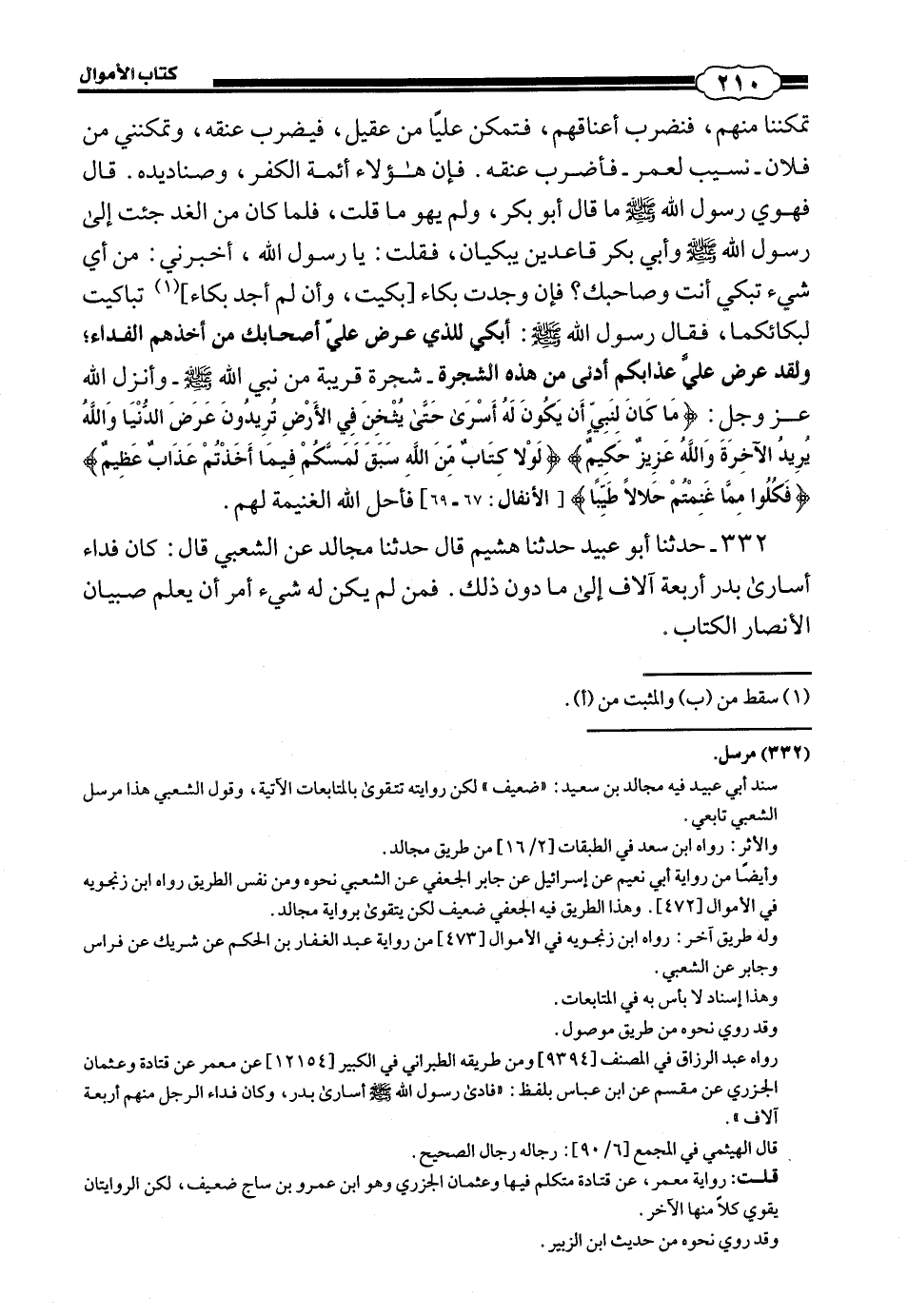332 - (308) حَدَّثَنَا أَبُو عُبَيْدٍ حَدَّثَنَا هُشَيْمٌ، قَالَ: حَدَّثَنَا مُجَالِدٌ، عَنِ الشَّعْبِيِّ، قَالَ: «كَانَ فِدَاءُ أُسَارَى بَدْرٍ أَرْبَعَةَ آلَافٍ إِلَى مَا دُونَ ذَلِكَ فَمَنْ لَمْ يَكُنْ لَهُ شَيْءٌ أُمِرَ أَنْ يُعَلِّمَ صِبْيَانَ الْأَنْصَارِ الْكِتَابَ».