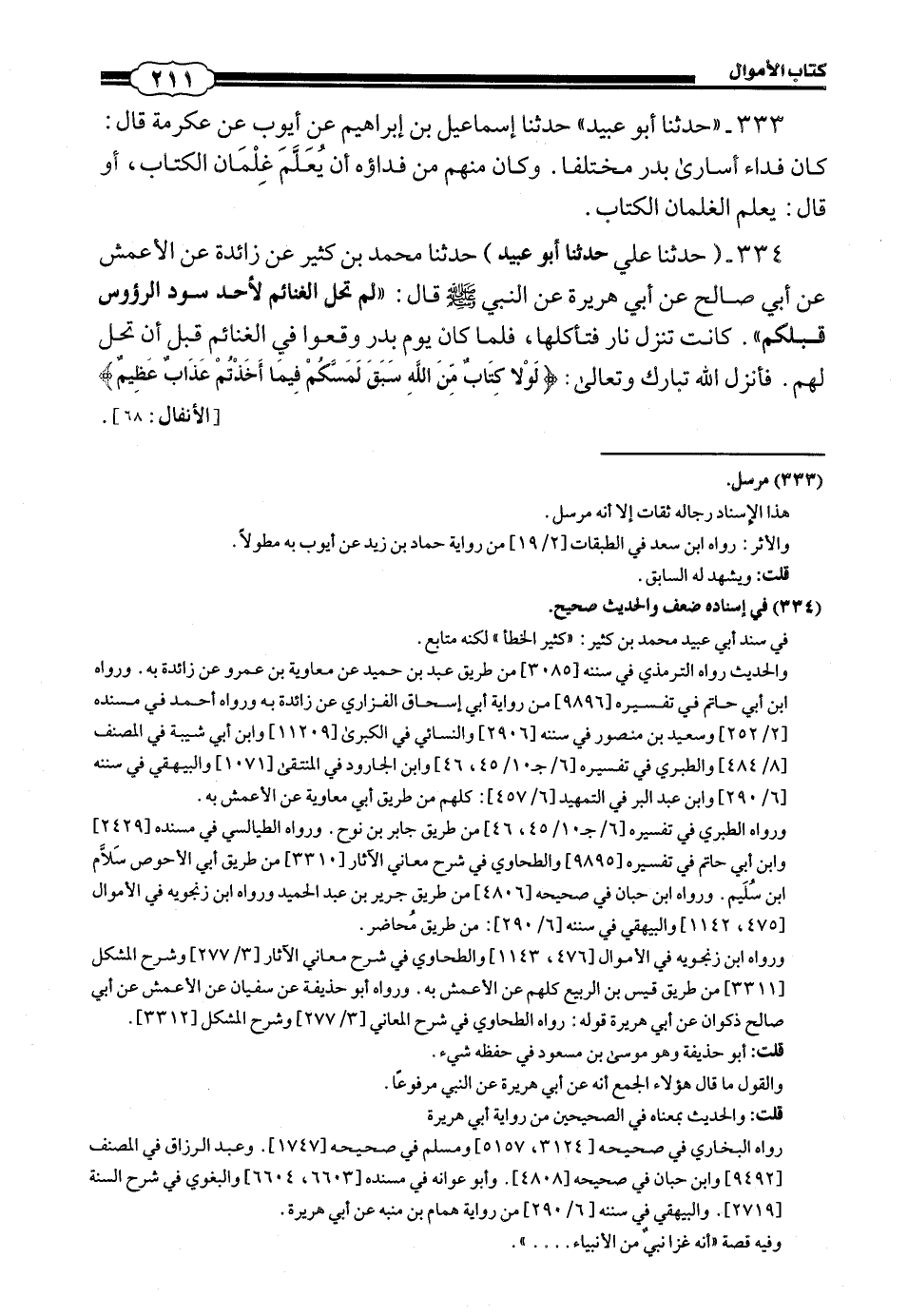 333 - (309) حَدَّثَنَا أَبُو عُبَيْدٍ حَدَّثَنَا إِسْمَاعِيلُ بْنُ إِبْرَاهِيمَ، عَنْ أَيُّوبَ، عَنْ عِكْرِمَةَ، قَالَ: كَانَ فِدَاءُ أُسَارَى بَدْرٍ مُخْتَلِفًا وَكَانَ مِنْهُمْ مَنْ فِدَاؤُهُ أَنْ يُعَلِّمَ غِلْمَانَ الْكِتَابَ، أَوْ قَالَ يُعَلِّمَ الْغِلْمَانَ الْكِتَابَ.
