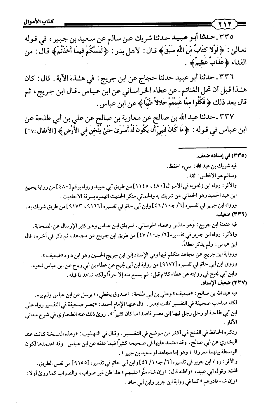 337 - (313) حَدَّثَنَا عَبْدُ اللَّهِ بْنُ صَالِحٍ، عَنْ مُعَاوِيَةَ بْنِ صَالِحٍ، عَنْ عَلِيِّ بْنِ أَبِي طَلْحَةَ، عَنِ ابْنِ عَبَّاسٍ، فِي قَوْلِهِ: {مَا كَانَ لِنَبِيٍّ أَنْ يَكُونَ لَهُ أَسْرَى حَتَّى يُثْخِنَ فِي الْأَرْضِ} [الأنفال: 67] #213# قَالَ: كَانَ ذَلِكَ يَوْمَ بَدْرٍ، وَالْمُسْلِمُونَ يَوْمَئِذٍ قَلِيلٌ فَلَمَّا كَثُرُوا وَاشْتَدَّ سُلْطَانُهُمْ أَنْزَلَ اللَّهُ عَزَّ وَجَلَّ: {فَإِمَّا مَنًّا بَعْدُ وَإِمَّا فِدَاءً} [محمد: 4] فَجَعَلَ اللَّهُ النَّبِيَّ صَلَّى اللهُ عَلَيْهِ وَسَلَّمَ وَالْمُؤْمِنِينَ فِي الْأُسَارَى بِالْخِيَارِ إِنْ شَاءُوا قَتَلُوهُمْ وَإِنْ شَاءُوا فَادُوهُمْ. قَالَ أَبُو عُبَيْدٍ: وَأَظُنُّهُ قَالَ: وَإِنْ شَاءُوا مَنُّوا عَلَيْهِمْ.