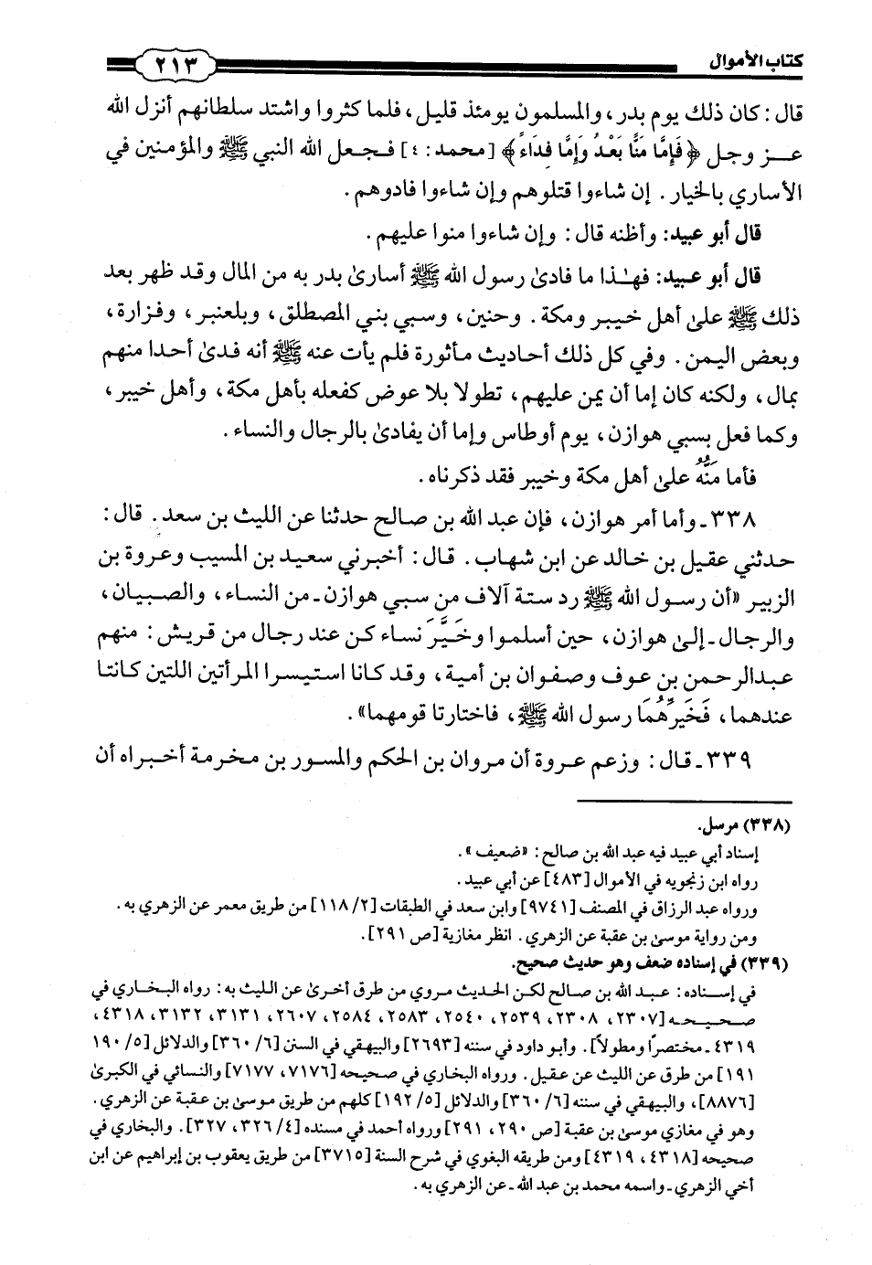 338 - (314) وَأَمَّا أَمْرُ هَوَازِنَ، فَإِنَّ عَبْدَ اللَّهِ بْنَ صَالِحٍ حَدَّثَنَا، عَنِ اللَّيْثِ بْنِ سَعْدٍ، قَالَ: حَدَّثَنِي عُقَيْلُ بْنُ خَالِدٍ، عَنِ ابْنِ شِهَابٍ، قَالَ: أَخْبَرَنِي سَعِيدُ بْنُ الْمُسَيِّبِ وَعُرْوَةُ بْنُ الزُّبَيْرِ: أَنَّ رَسُولَ اللَّهِ صَلَّى اللهُ عَلَيْهِ وَسَلَّمَ رَدَّ سِتَّةَ آلَافٍ مِنْ سَبْيِ هَوَازِنَ، مِنَ النِّسَاءِ، وَالصِّبْيَانِ، وَالرِّجَالِ إِلَى هَوَازِنَ حِينَ أَسْلَمُوا وَخَيَّرَ نِسَاءً كُنَّ عِنْدَ رِجَالٍ مِنْ قُرَيْشٍ: مِنْهُمْ عَبْدُ الرَّحْمَنِ بْنُ عَوْفٍ وَصَفْوَانُ بْنُ أُمَيَّةَ، وَقَدْ كَانَا اسْتَيْسَرَا الْمَرْأَتَيْنِ اللَّتَيْنِ كَانَتَا عِنْدَهُمَا، فَخَيَّرَهُمَا رَسُولُ اللَّهِ صَلَّى اللهُ عَلَيْهِ وَسَلَّمَ فَاخْتَارَتَا قَوْمَهُمَا،