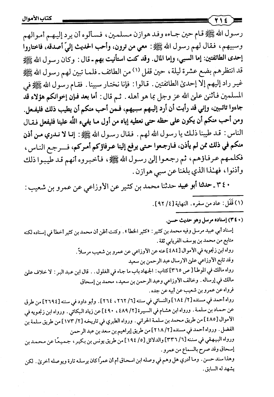 340 - (315) حَدَّثَنَا أَبُو عُبَيْدٍ حَدَّثَنَا مُحَمَّدُ بْنُ كَثِيرٍ، عَنِ الْأَوْزَاعِيِّ، عَنْ عَمْرِو بْنِ شُعَيْبٍ، #215# أَنَّ رَسُولَ اللَّهِ صَلَّى اللهُ عَلَيْهِ وَسَلَّمَ أَتَتْهُ هَوَازِنُ، فَقَالُوا: يَا رَسُولَ اللَّهِ، أَنْتُمُ الْوَالِدُ وَنَحْنُ الْوَلَدُ - أَوْ قَالُوا: أَنْتُمُ الْوَلَدُ وَنَحْنُ الْوَالِدُ - جِئْنَاكَ لِنَسْتَشْفِعَ بِكَ عَلَى الْمُؤْمِنِينَ وَنَسْتَشْفِعُ بِالْمُؤْمِنِينَ عَلَيْكَ، أَمَّا مَا كَانَ مِنْ أَمْوَالِنَا فَهِيَ لَكَ طَيِّبَةً بِذَلِكَ أَنْفُسُنَا، وَأَمَّا مَا كَانَ مِنْ ذَرَارِيِّنَا فَرُدَّهُ عَلَيْنَا، قَالَ رَسُولُ اللَّهِ صَلَّى اللهُ عَلَيْهِ وَسَلَّمَ: إِذَا كَانَ الْعَشِيَّةُ فَقُومُوا فَقُولُوا مِثْلَ مَقَالَتِكُمْ فَلَمَّا كَانَ الْعَشِيُّ قَامُوا فَقَالُوا مِثْلَ مَقَالَتِهُمْ، فَقَالَ رَسُولُ اللَّهِ صَلَّى اللهُ عَلَيْهِ وَسَلَّمَ: أَمَّا مَا كَانَ لِلَّهِ وَلِرَسُولِهِ فَهُوَ لَكُمْ فَقَالَ الْمُهَاجِرُونَ: أَمَّا مَا كَانَ لَنَا فَهُوَ لِلَّهِ وَلِرَسُولِهِ، وَقَالَتِ الْأَنْصَارُ مِثْلَ ذَلِكَ، فَقَالَ الْعَبَّاسُ بْنُ مِرْدَاسٍ: أَمَّا مَا كَانَ لِي وَلِبَنِي سُلَيْمٍ فَلَا أَهَبُهُ، فَقَالَتْ بَنُو سُلَيْمٍ: أَمَّا مَا كَانَ لَنَا فَهُوَ لِلَّهِ وَلِرَسُولِهِ، وَأَمَّا مَا كَانَ لَكَ فَشَانَكَ بِهِ، وَقَالَ الْأَقْرَعُ بْنُ حَابِسٍ مِثْلَ ذَلِكَ، وَقَالَ عُيَيْنَةُ بْنُ حِصْنٍ مِثْلَ ذَلِكَ، فَرَدَّتْ إِحْدَى الْقَبِيلَتَيْنِ عَلَى صَاحِبِهِمْ مِثْلَ قَوْلِ بَنِي سُلَيْمٍ قَالَ مُحَمَّدُ بْنُ كَثِيرٍ لَا أَدْرِي أَيَّتُهَا هِيَ؟ قَالَ أَبُو عُبَيْدٍ: فَهَذَا أَمْرُ هَوَازِنَ.