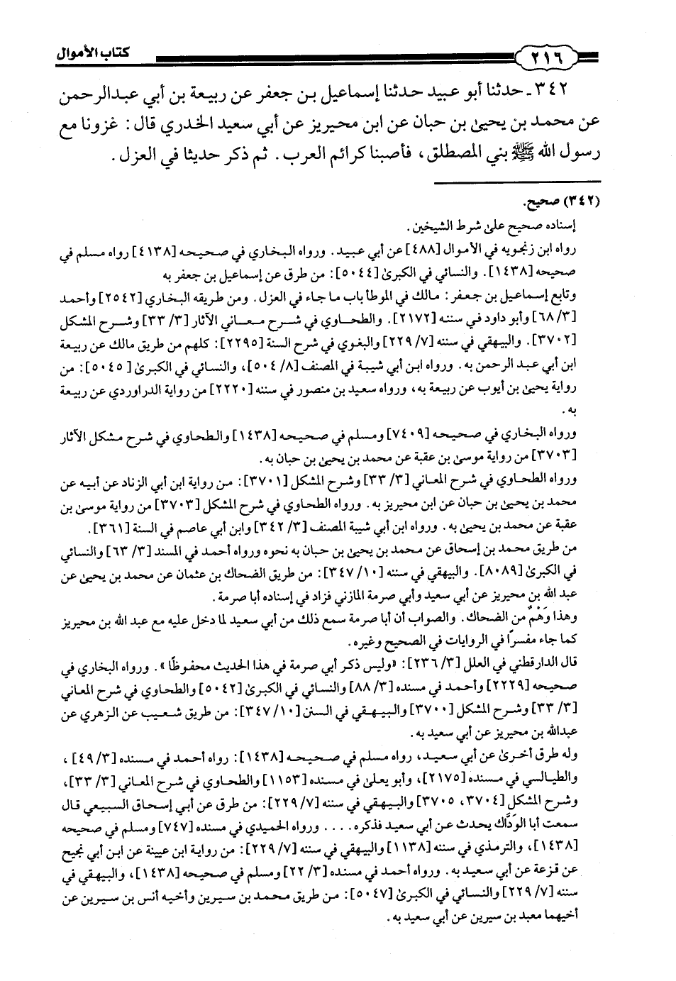 342 - (317) حَدَّثَنَا أَبُو عُبَيْدٍ حَدَّثَنَا إِسْمَاعِيلُ بْنُ جَعْفَرٍ، عَنْ رَبِيعَةَ بْنِ أَبِي عَبْدِ الرَّحْمَنِ، عَنْ مُحَمَّدِ بْنِ يَحْيَى بْنِ حَبَّانَ، عَنِ ابْنِ مُحَيْرِيزٍ، عَنْ أَبِي سَعِيدٍ الْخُدْرِيِّ، قَالَ: «غَزَوْنَا مَعَ رَسُولِ اللَّهِ صَلَّى اللهُ عَلَيْهِ وَسَلَّمَ بَنِي الْمُصْطَلِقِ، فَأَصَبْنَا كَرَائِمَ الْعَرَبِ». ثُمَّ ذَكَرَ حَدِيثًا فِي الْعَزْلِ.