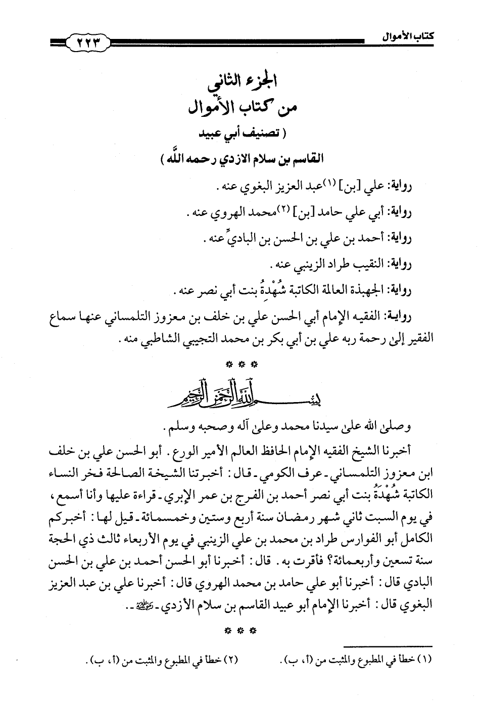 أَخْبَرَنَا الشَّيْخُ الْفَقِيهُ الْإِمَامُ الْحَافِظُ الْعَالِمُ الْأَمِيرُ الْوَرِعُ أَبُو الْحَسَنِ عَلِيُّ بْنُ خَلَفِ بْنِ مَعْزُوزٍ التِّلْمِسَانِيُّ عُرِّفَ الْكَوْمِيُّ قَالَ: أَخْبَرَتْنَا الشَّيْخَةُ الصَّالِحَةُ فَخْرُ النِّسَاءِ الْكَاتِبَةُ شُهْدَةُ بِنْتُ أَبِي نَصْرِِ أَحْمَدَ بْنِ الْفَرَجِ بْنِ عُمَرَ الْإِبَرِيُّ - قِرَاءَةً عَلَيْهَا وَأَنَا أَسْمَعُ , فِي يَوْمِ السَّبْتِ ثَانِي شَهْرِ رَمَضَانَ سَنَةَ أَرْبَعٍ وَسِتِّينَ وَخَمْسِمِائَةٍ - قِيْلَ لَهَا: أَخْبَرَكُمْ الْكَامِلُ أَبُو الْفَوَارِسِ طَرَّادُ بْنُ مُحَمَّدِ بْنِ عَلِيٍّ الزَّيْنَبِيُّ فِي يَوْمِ الْأَرْبِعَاءِ ثَالِثِ ذِي الْحِجَّةِ سَنَةَ تِسْعِينَ وَأَرْبَعِمِائَةٍ؟ فَأَقَرَّتْ بِهِ. قَالَ: أَخْبَرَنَا أَبُو الْحَسَنِ أَحْمَدُ بْنُ عَلِيِّ بْنِ الْحَسَنِ بْنِ الْبَادِيِّ قاَلَ: أَخْبَرَنَا أَبُو عَلِيِِّ حَامِدُ بْنُ مُحَمَّدِِ الْهَرَوِيُّ قَالَ: أَخْبَرَنَا عَلِيُّ بْنُ عَبْدِ الْعَزِيزِ الْبَغَوِيُّ قَالَ: أخبرنا الإمام أبو عبيد القاسم بن سلام الأزدي - رضي الله عنه -.