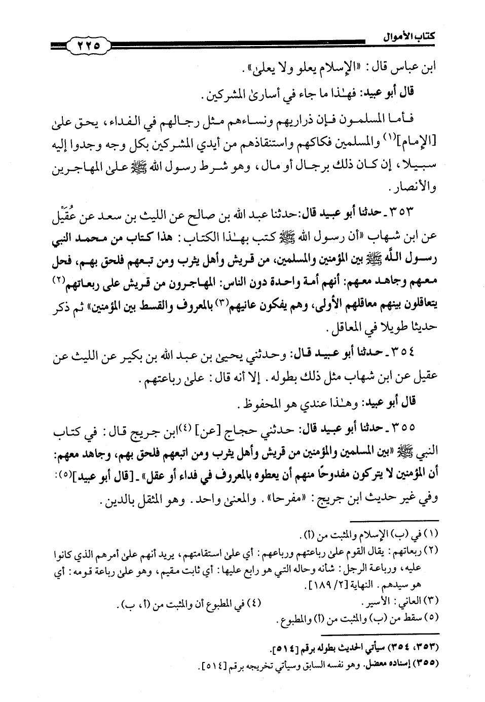 355 - (330) حَدَّثَنَا أَبُو عُبَيْدٍ قَالَ حَدَّثَنِي حَجَّاجٌ، عن ابْنَ جُرَيْجٍ، قَالَ: فِي كِتَابِ النَّبِيِّ صَلَّى اللهُ عَلَيْهِ وَسَلَّمَ: بَيْنَ الْمُسْلِمِينَ وَالْمُؤْمِنِينَ مِنْ قُرَيْشٍ وَأَهْلِ يَثْرِبَ وَمَنِ اتَّبَعَهُمْ فَلَحِقَ بِهِمْ، وَجَاهَدَ مَعَهُمْ: أَنَّ الْمُؤْمِنِينَ لَا يَتْرُكُونَ مَفْدُوحًا مِنْهُمْ أَنْ يُعْطُوهُ بِالْمَعْرُوفِ فِي فِدَاءٍ أَوْ عَقْلٍ.