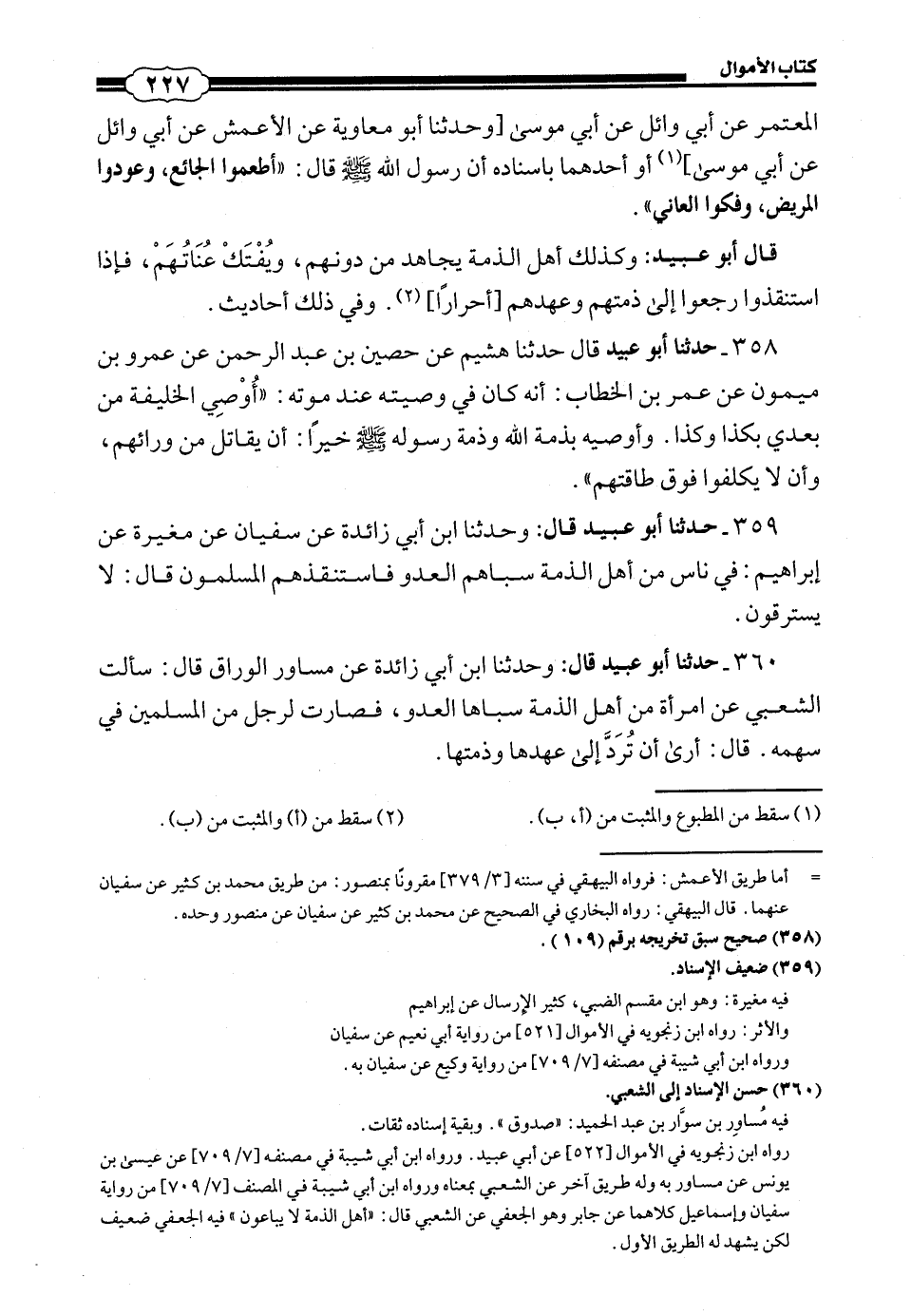 358 - (334) حَدَّثَنَا أَبُو عُبَيْدٍ قَالَ حَدَّثَنَا هُشَيْمٌ، عَنْ حُصَيْنِ بْنِ عَبْدِ الرَّحْمَنِ، عَنْ عَمْرِو بْنِ مَيْمُونٍ، عَنْ عُمَرَ بْنِ الْخَطَّابِ، أَنَّهُ كَانَ فِي وَصِيَّتِهِ عِنْدَ مَوْتِهِ: أُوْصِي الْخَلِيفَةَ مِنْ بَعْدِي بِكَذَا وَكَذَا وَأُوصِيهِ بِذِمَّةِ اللَّهِ وَذِمَّةِ رَسُولِهِ صَلَّى اللهُ عَلَيْهِ وَسَلَّمَ خَيْرًا: أَنْ يُقَاتِلَ مِنْ وَرَائِهِمْ، وَأَنْ لَا يُكَلَّفُوا فَوْقَ طَاقَتِهِمْ.