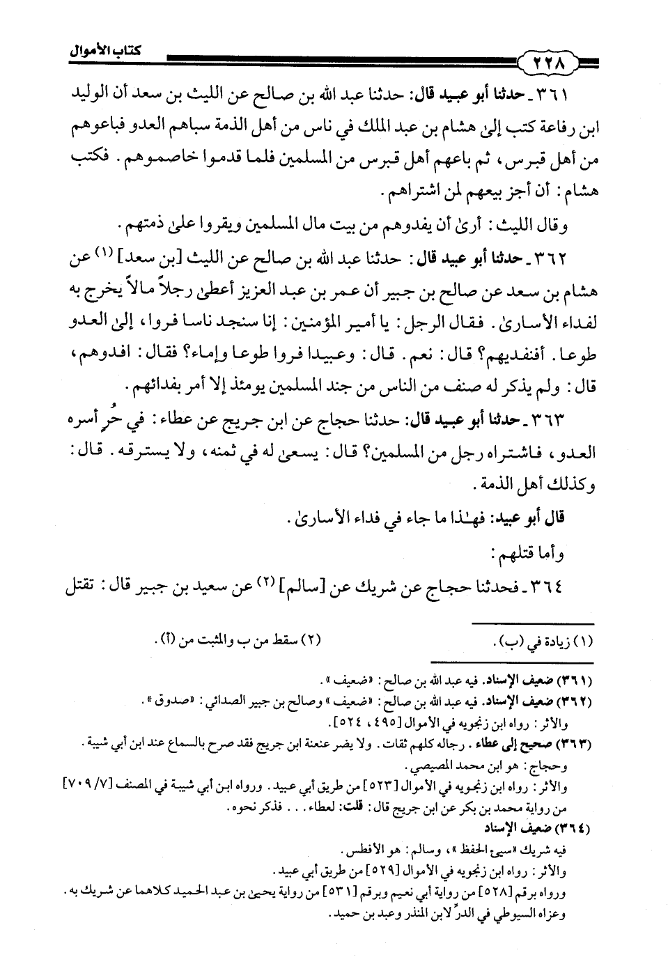 361 - (337) حَدَّثَنَا أَبُو عُبَيْدٍ قَالَ: حَدَّثَنَا عَبْدُ اللَّهِ بْنُ صَالِحٍ، عَنِ اللَّيْثِ بْنِ سَعْدٍ، أَنَّ الْوَلِيدَ بْنَ رِفَاعَةَ كَتَبَ إِلَى هِشَامِ بْنِ عَبْدِ الْمَلِكِ فِي نَاسٍ مِنْ أَهْلِ الذِّمَّةِ سَبَاهُمُ الْعَدُوُّ فَبَاعُوهُمْ مِنْ أَهْلِ قُبْرُسَ ثُمَّ بَاعَهُمْ أَهْلُ قُبْرُسَ مِنَ الْمُسْلِمِينَ، فَلَمَّا قَدِمُوا خَاصَمُوهُمْ فَكَتَبَ هِشَامٌ: أَنْ أَجْرِ بَيْعَهُمْ لِمَنِ اشْتَرَاهُمْ