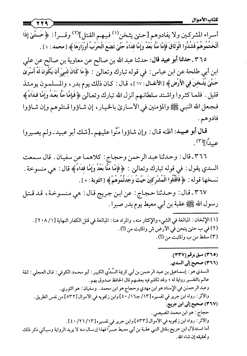 365 - (342) حَدَّثَنَا أَبُو عُبَيْدٍ قَالَ: حَدَّثَنَا عَبْدُ اللَّهِ بْنُ صَالِحٍ، عَنْ مُعَاوِيَةَ بْنِ صَالِحٍ، عَنْ عَلِيِّ بْنِ أَبِي طَلْحَةَ، عَنِ ابْنِ عَبَّاسٍ، فِي قَوْلِهِ تَبَارَكَ وَتَعَالَى: {مَا كَانَ لِنَبِيٍّ أَنْ يَكُونَ لَهُ أَسْرَى حَتَّى يُثْخِنَ فِي الْأَرْضِ} [الأنفال: 67] قَالَ: " كَانَ ذَلِكَ يَوْمَ بَدْرٍ، وَالْمُسْلِمُونَ يَوْمَئِذٍ قَلِيلٌ، فَلَمَّا كَثُرُوا وَاشْتَدَّ سُلْطَانُهُمْ أَنْزَلَ اللَّهُ تَبَارَكَ وَتَعَالَى: {فَإِمَّا مَنًّا بَعْدُ وَإِمَّا فِدَاءً} [محمد: 4] فَجَعَلَ اللَّهُ النَّبِيَّ صَلَّى اللهُ عَلَيْهِ وَسَلَّمَ وَالْمُؤْمِنِينَ فِي الْأُسَارَى بِالْخِيَارِ، إِنْ شَاءُوا قَتَلُوهُمْ وَإِنْ شَاءُوا فَادُوهُمْ ".