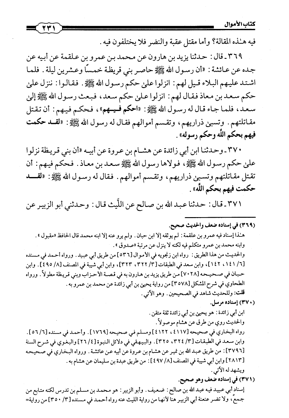 369 - (346) قَالَ حَدَّثَنَا يَزِيدُ بْنُ هَارُونَ، عَنْ مُحَمَّدِ بْنِ عَمْرِو بْنِ عَلْقَمَةَ، عَنْ أَبِيهِ، عَنْ جَدِّهِ، عَنْ عَائِشَةَ، أَنَّ رَسُولَ اللَّهِ صَلَّى اللهُ عَلَيْهِ وَسَلَّمَ حَاصَرَ بَنِي قُرَيْظَةَ خَمْساً وَعِشْرِينَ لَيْلَةً، فَلَمَّا اشْتَدَّ عَلَيْهِمُ الْبَلَاءُ قِيلَ لَهُمُ: انْزِلُوا عَلَى حُكْمِ رَسُولِ اللَّهِ صَلَّى اللهُ عَلَيْهِ وَسَلَّمَ فَقَالُوا نَنْزِلُ عَلَى حُكْمِ سَعْدِ بْنِ مُعَاذٍ، فَقَالَ لَهُمُ: انْزِلُوا عَلَى حُكْمِ سَعْدٍ، فَبَعَثَ رَسُولُ اللَّهِ صَلَّى اللهُ عَلَيْهِ وَسَلَّمَ إِلَى سَعْدٍ، فَلَمَّا جَاءَ قَالَ لَهُ رَسُولُ اللَّهِ صَلَّى اللهُ عَلَيْهِ وَسَلَّمَ: احْكُمْ فِيهِمْ فَحَكَمَ فِيهِمْ: أَنْ تُقْتَلَ مُقَاتِلَتُهُمْ، وَتُسْبَى ذَرَارِيُّهُمْ، وَتُقْسَمَ أَمْوَالُهُمْ فَقَالَ لَهُ رَسُولُ اللَّهِ صَلَّى اللهُ عَلَيْهِ وَسَلَّمَ: «لَقَدْ حَكَمْتَ فِيهِمْ بِحُكْمِ اللَّهِ وَحُكْمِ رَسُولِهِ».