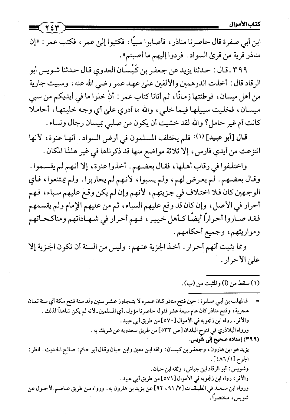 قَالَ أَبُو عُبَيْدٍ: فَلَمْ يَخْتَلِفِ الْمُسْلِمُونَ فِي أَرْضِ السَّوَادِ أَنَّهَا عَنْوَةٌ، لِأَنَّهَا انْتُزِعَتْ مِنْ أَيْدِي فَارِسَ، إِلَّا ثَلَاثَةَ مَوَاضِعَ مِنْهَا قَدْ ذَكَرْنَاهَا فِي غَيْرِ هَذَا الْمَكَانِ. وَاخْتَلَفُوا فِي رِقَابِ أَهْلِهَا، فَقَالَ بَعْضُهُمْ: أُخِذُوا عَنْوَةً، إِلَّا أَنَّهُمْ لَمْ يُقْسَمُوا، وَقَالَ بَعْضُهُمْ: لَمْ يُعْرَضْ لَهُمْ، وَلَمْ يُسْبَوْا، لِأَنَّهُمْ لَمْ يُحَارِبُوا، وَلَمْ يَمْتَنِعُوا، فَأَيُّ الْوَجْهَيْنِ كَانَ فَلَا اخْتِلَافَ فِي جِزْيَتِهِمْ، لِأَنَّهُمْ إِنْ لَمْ يَكُنْ وَقَعَ عَلَيْهِمْ سِبَاءٌ، فَهُمْ أَحْرَارٌ فِي الْأَصْلِ، وَإِنْ كَانَ قَدْ وَقَعَ عَلَيْهِمُ السِّبَاءُ، ثُمَّ مَنَّ عَلَيْهِمُ الْإِمَامُ وَلَمْ يَقْسِمْهُمْ فَقَدْ صَارُوا أَحْرَارًا أَيْضًا، كَأَهْلِ خَيْبَرَ، فَهُمْ أَحْرَارٌ فِي شَهَادَاتِهِمْ وَمُنَاكَحَاتِهِمْ وَمَوَارِيثِهِمْ وَجَمِيعِ أَحْكَامِهِمْ، وَمِمَّا يُثْبِتُ أَنَّهُمْ أَحْرَارٌ أَخْذُ الْجِزْيَةِ عَنْهُمْ، وَلَيْسَ مِنَ السُّنَّةِ أَنْ تَكُونَ الْجِزْيَةُ إِلَّا عَلَى الْأَحْرَارِ.