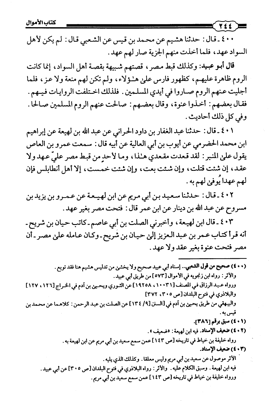 قَالَ أَبُو عُبَيْدٍ: وَكَذَلِكَ قِبْطُ مِصْرَ قِصَّتُهُمْ شَبِيهَةٌ بِقِصَّةِ أَهْلِ السَّوَادِ، إِنَّمَا كَانَتِ الرُّومُ ظَاهِرَةً عَلَيْهِمْ، كَظُهُورِ فَارِسَ عَلَى هَؤُلَاءِ، وَلَمْ تَكُنْ لَهُمْ مَنَعَةٌ وَلَا عِزٌّ، فَلَمَّا أُجْلِيَتْ عَنْهُمُ الرُّومُ صَارُوا فِي أَيْدِي الْمُسْلِمِينَ، فَلِذَلِكَ اخْتَلَفَتِ الرِّوَايَاتُ فِيهِمْ، فَقَالَ بَعْضُهُمْ: أُخِذُوا عَنْوَةً، وَقَالَ بَعْضُهُمْ: صَالَحَتْ عَنْهُمُ الرُّومُ الْمُسْلِمِينَ صُلْحًا وَفِي كُلِّ ذَلِكَ أَحَادِيثُ.