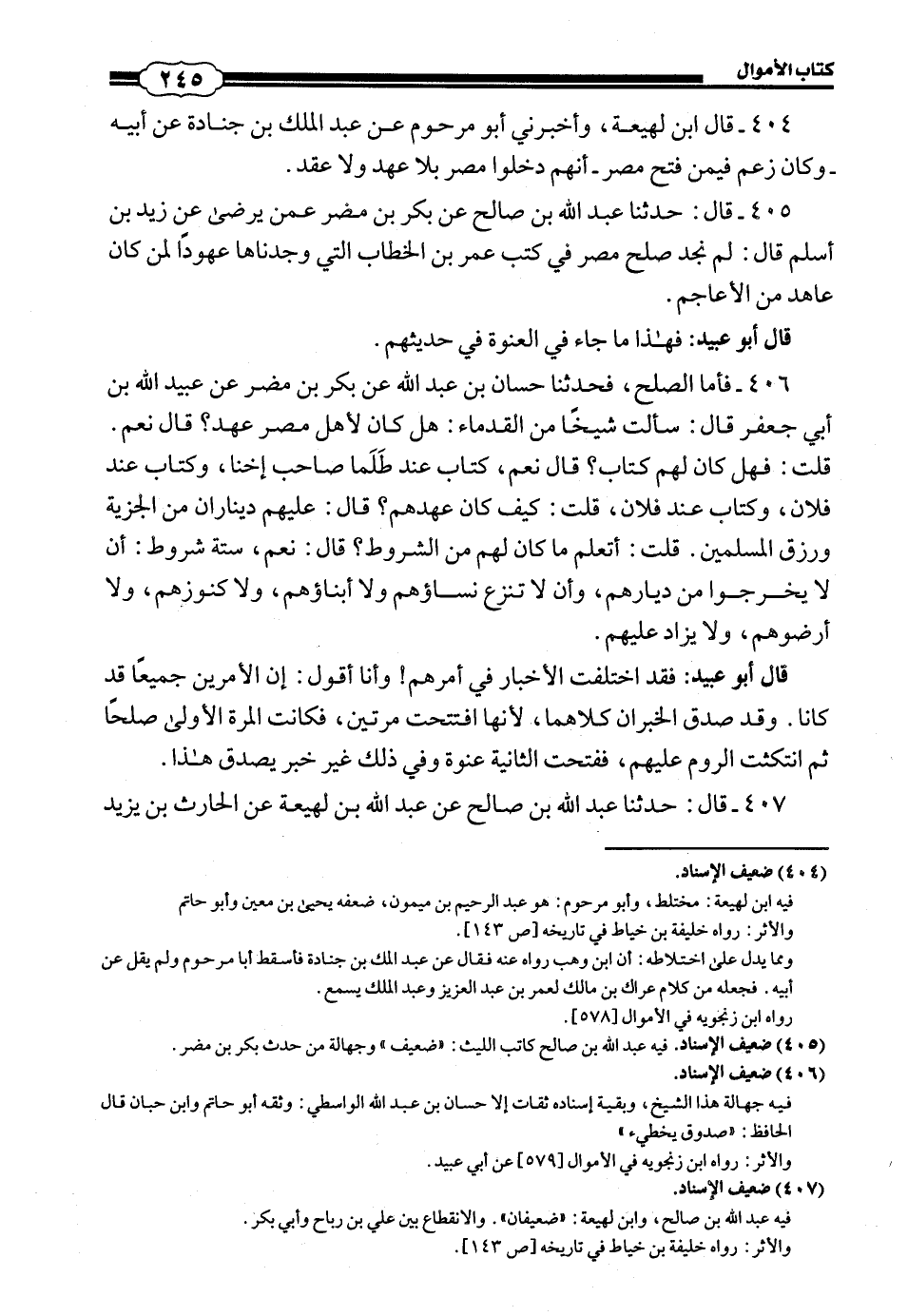 405 - (384) قَالَ: حَدَّثَنَا عَبْدُ اللَّهِ بْنُ صَالِحٍ، عَنْ بَكْرِ بْنِ مُضَرَ، عَمنْ يَرْضَى، عَنْ زَيْدِ بْنِ أَسْلَمَ، قَالَ: لَمْ نَجِدْ صُلْحَ مِصْرَ فِي كُتُبِ عُمَرَ بْنِ الْخَطَّابِ الَّتِي وَجَدْنَاهَا عُهُودًا لِمَنْ كَانَ عَاهَدَ مِنَ الْأَعَاجِمِ.