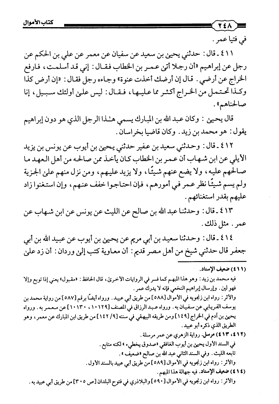 411 - (390) قَالَ: حَدَّثَنِي يَحْيَى بْنُ سَعِيدٍ، عَنْ سُفْيَانَ، عَنْ مَعْمَرٍ، عَنْ عَلِيِّ بْنِ الْحَكَمِ، عَنْ رَجُلٍ، عَنْ إِبْرَاهِيمَ، أَنَّ رَجُلًا أَتَى عُمَرَ بْنَ الْخَطَّابِ، فَقَالَ: إِنِّي قَدْ أَسْلَمْتُ، فَارْفَعِ الْخَرَاجَ عَنْ أَرْضِي، قَالَ: إِنَّ أَرْضَكَ أُخِذَتْ عَنْوَةً وَجَاءَهُ رَجُلٌ، فَقَالَ: إِنَّ أَرْضَ كَذَا وَكَذَا تَحْتَمِلُ مِنَ الْخَرَاجِ أَكْثَرَ مِمَّا عَلَيْهَا، فَقَالَ: لَيْسَ عَلَى أُولَئِكَ سَبِيلٌ، إِنَّا صَالَحْنَاهُمْ قَالَ يَحْيَى: وَكَانَ عَبْدُ اللَّهِ بْنُ الْمُبَارَكِ يُسَمِّي هَذَا الرَّجُلَ الَّذِي هُوَ دُونَ إِبْرَاهِيمَ يَقُولُ: هُوَ مُحَمَّدُ بْنُ زَيْدٍ، وَكَانَ قَاضِيًا بِخُرَاسَانَ.