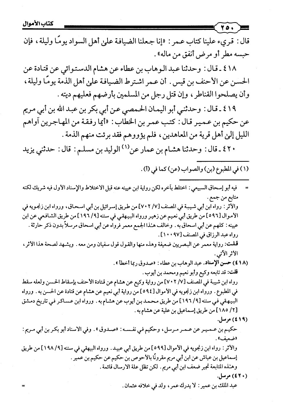 418 - (396) قَالَ: وَحَدَّثَنَا عَبْدُ الْوَهَّابِ بْنُ عَطَاءٍ، عَنْ هِشَامٍ الدَّسْتُوَائِيِّ، عَنْ قَتَادَةَ، عَنِ الْحَسَنِ، عَنِ الْأَحْنَفِ بْنِ قَيْسٍ، أَنَّ عُمَرَ اشْتَرَطَ الضِّيَافَةَ عَلَى أَهْلِ الذِّمَّةِ يَوْمًا وَلَيْلَةَ، وَأَنْ يُصْلِحُوا الْقَنَاطِرَ، وَإِنْ قُتِلَ رَجُلٌ مِنَ الْمُسْلِمِينَ بِأَرْضِهِمْ فَعَلَيْهِمْ دِيَتُهُ.
