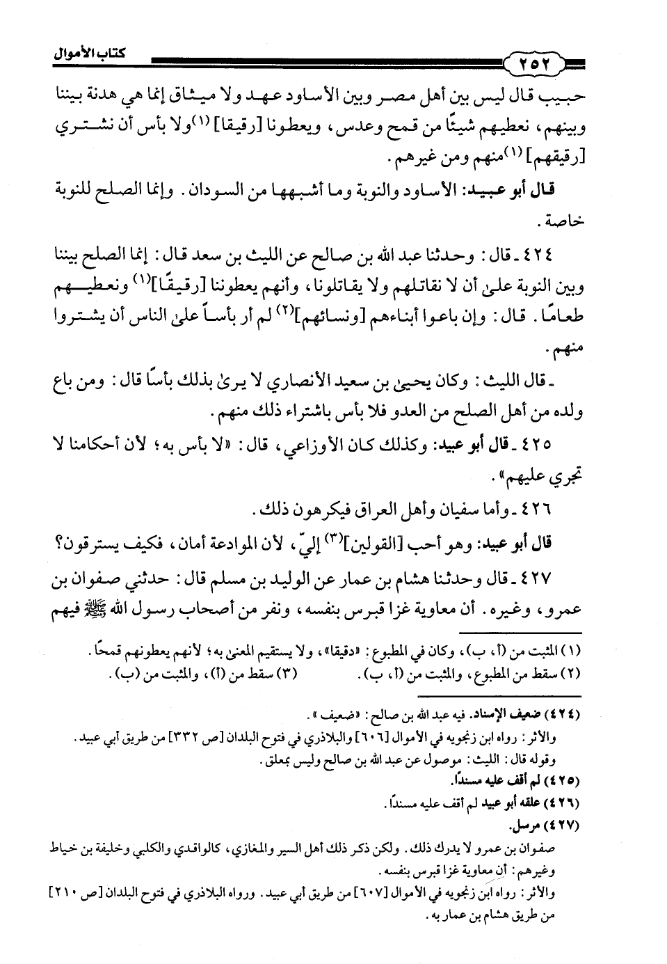 424 - (402) قَالَ: وَحَدَّثَنَا عَبْدُ اللَّهِ بْنُ صَالِحٍ، عَنِ اللَّيْثِ بْنِ سَعْدٍ، قَالَ: إِنَّمَا الصُّلْحُ بَيْنَنَا وَبَيْنَ النُّوبَةِ عَلَى أَنْ لَا نُقَاتِلَهُمْ وَلَا يُقَاتِلُونَا، وَأَنَّهُمْ يُعْطُونَنَا رَقِيقًا وَنُعْطِيهِمْ طَعَامًا، قَالَ: وَإِنْ بَاعُوا أَبْنَاءَهُمْ ونسائهم لَمْ أَرْ بَاسًا عَلَى النَّاسِ أَنْ يَشْتَرُوا مِنْهُمْ.
