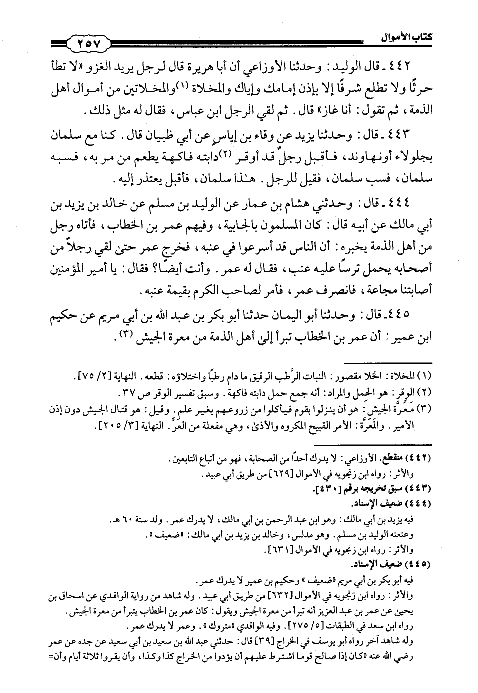 442 - (421) قَالَ الْوَلِيدُ: وَحَدَّثَنَا الْأَوْزَاعِيُّ، أَنَّ أَبَا هُرَيْرَةَ قَالَ لِرَجُلٍ يُرِيدُ الْغَزْوَ: لَا تَطَا حَرْثًا وَلَا تَطْلُعْ شَرَفًا إِلَّا بِإِذْنِ إِمَامِكَ، وَإِيَّاكَ وَالْمِخْلَاةُ وَالْمِخْلَاتَيْنِ مِنْ أَمْوَالِ أَهْلِ الذِّمَّةِ، ثُمَّ تَقُولُ: أَنَا غَازٍ، قَالَ: ثُمَّ لَقِيَ الرَّجُلُ ابْنَ عَبَّاسٍ، فَقَالَ لَهُ مِثْلَ ذَلِكَ.