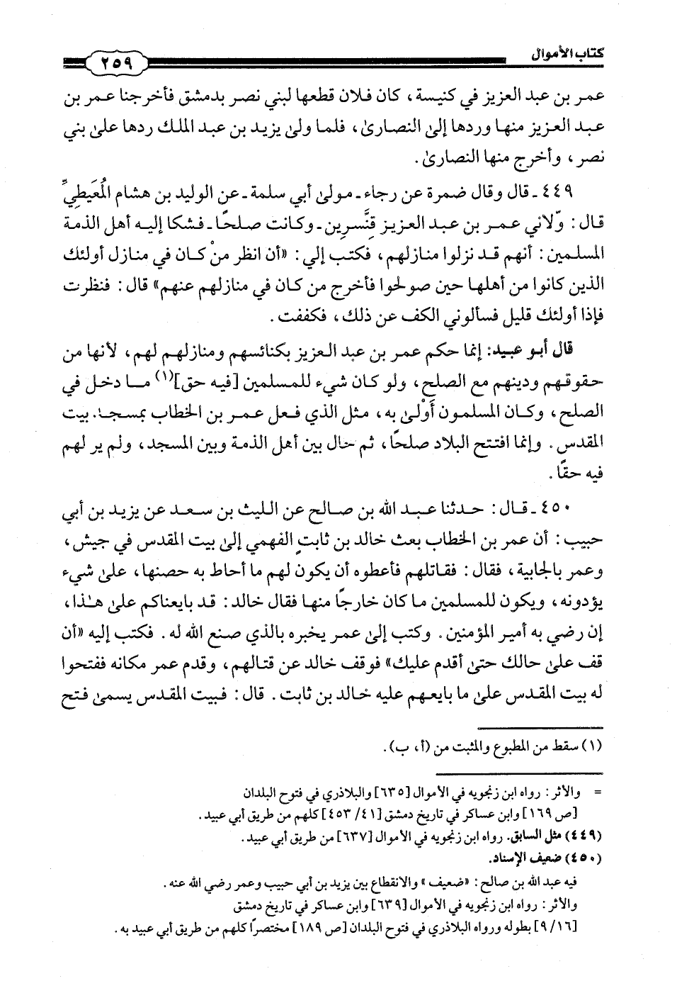 450 - (429) قَالَ: حَدَّثَنَا عَبْدُ اللَّهِ بْنُ صَالِحٍ، عَنِ اللَّيْثِ بْنِ سَعْدٍ، عَنْ يَزِيدَ بْنِ أَبِي حَبِيبٍ، أَنَّ عُمَرَ بْنَ الْخَطَّابِ بَعَثَ خَالِدَ بْنَ ثَابِتٍ الْفَهْمِيَّ إِلَى بَيْتِ الْمَقْدِسِ فِي جَيْشٍ، وَعُمَرُ بِالْجَابِيَةِ، فَقَالَ: فَقَاتَلَهُمْ فَأَعْطَوْهُ أَنْ يَكُونَ لَهُمْ مَا أَحَاطَ بِهِ حِصْنُهَا، عَلَى شَيْءٍ يُؤَدُّونَهُ، وَيَكُونُ لِلْمُسْلِمِينَ مَا كَانَ خَارِجًا مِنْهَا، فَقَالَ خَالِدٌ: قَدْ بَايَعْنَاكُمْ عَلَى هَذَا، إِنْ رَضِيَ بِهِ أَمِيرُ الْمُؤْمِنِينَ، وَكَتَبَ إِلَى عُمَرَ يُخْبِرُهُ بِالَّذِي صَنَعَ اللَّهُ لَهُ، فَكَتَبَ إِلَيْهِ: «أَنْ قِفْ عَلَى حَالِكَ حَتَّى أَقْدَمَ عَلَيْكَ»، فَوَقَفَ خَالِدٌ عَنْ قِتَالِهِمْ، وَقَدِمَ عُمَرُ مَكَانَهُ فَفَتَحُوا لَهُ بَيْتَ الْمَقْدِسِ عَلَى مَا بَايَعَهُمْ عَلَيْهِ خَالِدُ بْنُ ثَابِتٍ، قَالَ: فَبَيْتُ الْمَقْدِسِ يُسَمَّى فَتْحُ #260# عُمَرَ بْنِ الْخَطَّابِ.