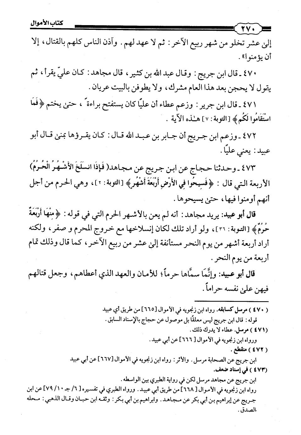 قَالَ أَبُو عُبَيْدٍ: يُرِيدُ مُجَاهِدٌ: أَنَّهُ لَمْ يَعْنِ بِالْأَشْهُرِ الْحُرُمِ الَّتِي فِي قَوْلِهِ: {مِنْهَا أَرْبَعَةٌ حُرُمٌ} [التوبة: 36] وَلَوْ أَرَادَ تِلْكَ لَكَانَ انْسِلَاخُهَا مَعَ خُرُوجِ الْمُحَرِّمِ وَاسْتِهْلَالِ صَفَرَ، وَلَكِنَّهُ أَرَادَ أَرْبَعَةَ أَشْهُرٍ مِنْ يَوْمِ النَّحْرِ مُسْتَانَفَةً إِلَى عَشْرٍ مِنْ رَبِيعٍ الْآخَرِ، كَمَا قَالَ: وَذَلِكَ تَمَامُ أَرْبَعَةٍ مِنْ يَوْمِ النَّحْرِ. قَالَ أَبُو عُبَيْدٍ: وَإِنَمَا سَمَّاهَا حُرُمًا لِلْأَمَانِ وَالْعَهْدِ الَّذِي أَعْطَاهُمْ، وَجَعَلَ قِتَالَهُمْ فِيهِنَّ عَلَى نَفْسِهِ حَرَامًا.