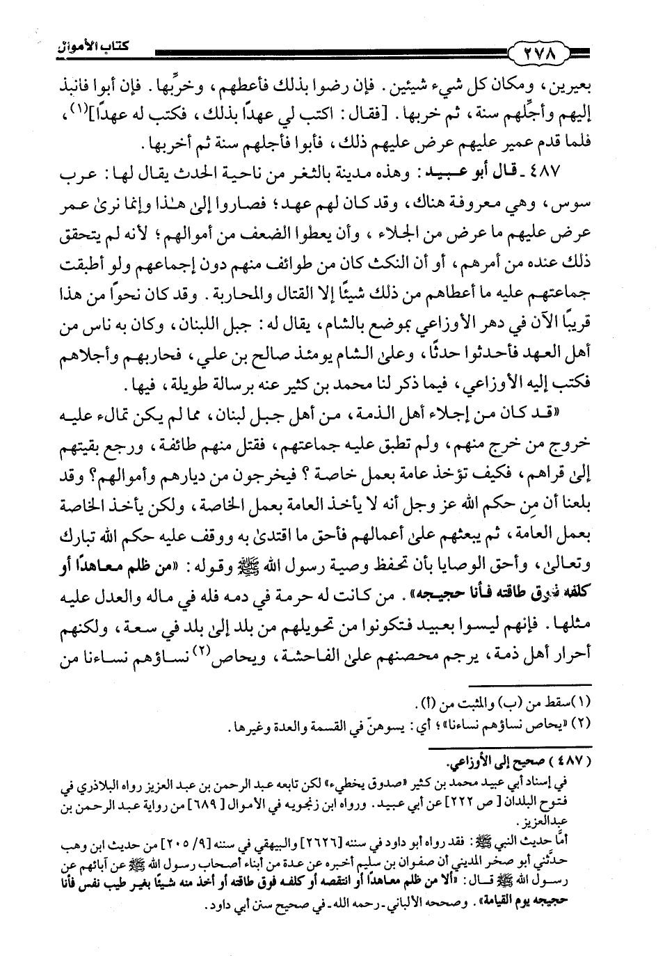487 - قَالَ أَبُو عُبَيْدٍ: وَهَذِهِ مَدِينَةٌ بِالثَّغْرِ مِنْ نَاحِيَةِ الْحَدَثِ يُقَالَ لَهَا: عَرْبَ سُوس، وَهِيَ مَعْرُوفَةٌ هُنَاكَ، وَقَدْ كَانَ لَهُمْ عَهْدٌ، فَصَارُوا إِلَى هَذَا، وَإِنَّمَا نَرَى عُمَرَ عَرَضَ عَلَيْهِمْ مَا عَرَضَ مِنَ الْجَلَاءِ، وَأَنْ يُعْطُوا الضِّعْفَ مِنْ أَمْوَالِهِمْ، لِأَنَّهُ لَمْ يَتَحَقَّقْ ذَلِكَ عِنْدَهُ مِنْ أَمْرِهِمْ، أَوْ أَنَّ النَّكْثَ كَانَ مِنْ طَوَائِفَ مِنْهُمْ دُونَ إِجْمَاعِهِمْ وَلَوْ أَطْبَقَتْ جَمَاعَتُهُمْ عَلَيْهِ مَا أَعْطَاهُمْ مِنْ ذَلِكَ شَيْئًا إِلَّا الْقِتَالَ وَالْمُحَارَبَةَ، وَقَدْ كَانَ نَحْوا مِنْ هَذَا قَرِيبًا الْآنَ فِي دَهْرِ الْأَوْزَاعِيِّ بِمَوْضِعٍ بِالشَّامِ، يُقَالَ لَهُ: جَبَلُ اللُبْنَانَ، وَكَانَ بِهِ نَاسٌ مِنْ أَهْلِ الْعَهْدِ فَأَحْدَثُوا حَدَثًا، وَعَلَى الشَّامِ يَوْمَئِذٍ صَالِحُ بْنُ عَلِيٍّ، فَحَارَبَهُمْ وَأَجْلَاهُمْ فَكَتَبَ إِلَيْهِ الْأَوْزَاعِيُّ، فِيمَا ذَكَرَ لَنَا مُحَمَّدُ بْنُ كَثِيرٍ عَنْهُ، بِرِسَالَةٍ طَوِيلَةٍ، فِيهَا.