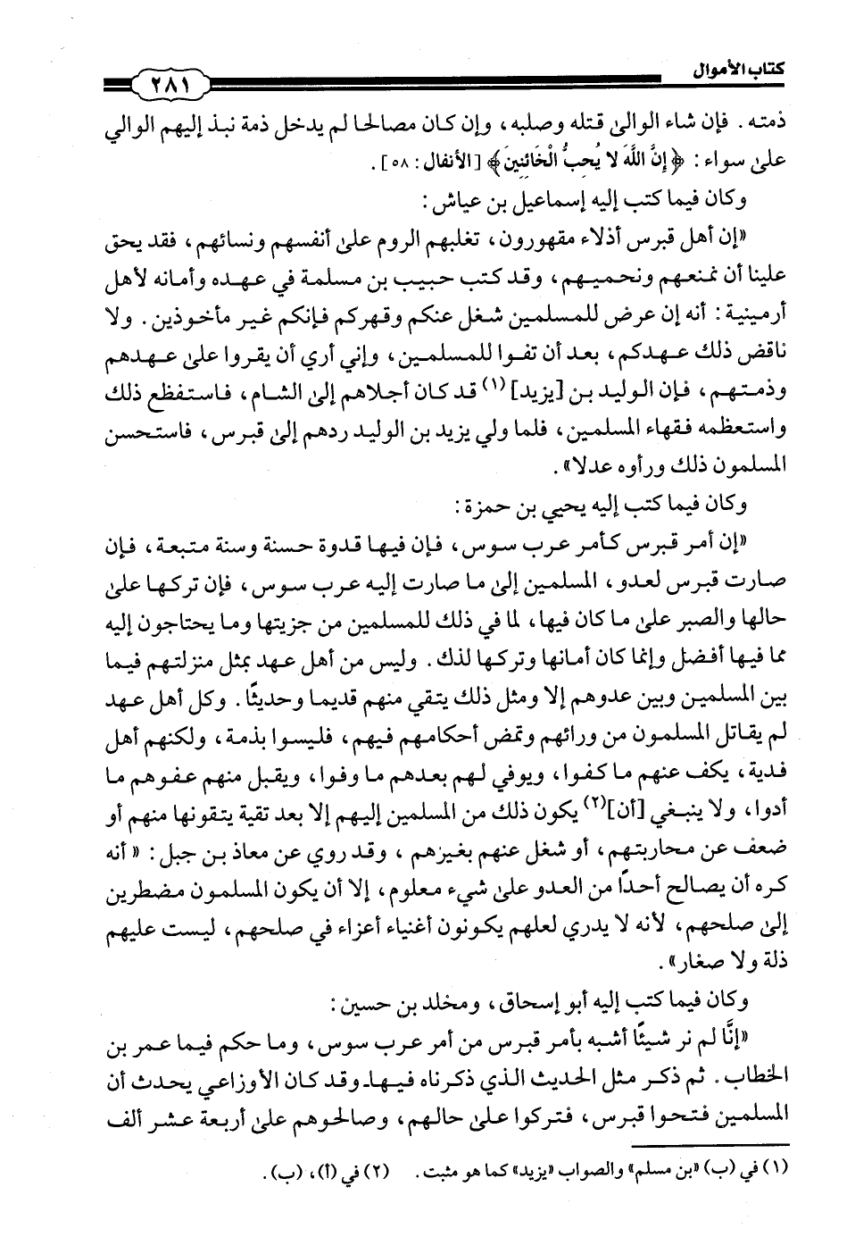 (473) إِنَّ أَهْلَ قُبْرُسَ أَذِلَّاءُ مَقْهُورُونَ، تَغْلِبُهُمُ الرُّومُ عَلَى أَنْفُسِهِمْ وَنِسَائِهِمْ، فَقَدْ يَحِقُّ عَلَيْنَا أَنْ نَمْنَعَهُمْ وَنَحْمِيهِمْ، وَقَدْ كَتَبَ حَبِيبُ بْنُ مَسْلَمَةَ فِي عَهْدِهِ وَأَمَانِهِ لِأَهْلِ أَرْمِينِيَةَ أَنَّهُ إِنْ عَرَضَ لِلْمُسْلِمِينَ شُغْلٌ عَنْكُمْ وَقَهْرِكُمْ فَإِنَّكُمْ غَيْرُ مَاخُوذِينَ، وَلَا نَاقِضٌ ذَلِكَ عَهْدَكُمْ، بَعْدَ أَنْ تَفُوا لِلْمُسْلِمِينَ، وَإِنِّي أَرَى أَنْ يُقَرُّوا عَلَى عَهْدِهِمْ وَذِمَّتِهِمْ، فَإِنَّ الْوَلِيدَ بْنَ يَزِيدَ قَدْ كَانَ أَجْلَاهُمْ إِلَى الشَّامِ، فَاسْتَفْظَعَ ذَلِكَ وَاسْتَعْظَمَهُ فُقَهَاءُ الْمُسْلِمِينَ، فَلَمَّا وَلِيَ يَزِيدُ بْنُ الْوَلِيدِ رَدَّهُمْ إِلَى قُبْرُسَ، فَاسْتَحْسَنَ الْمُسْلِمُونَ ذَلِكَ وَرَأَوْهُ عَدْلًا.