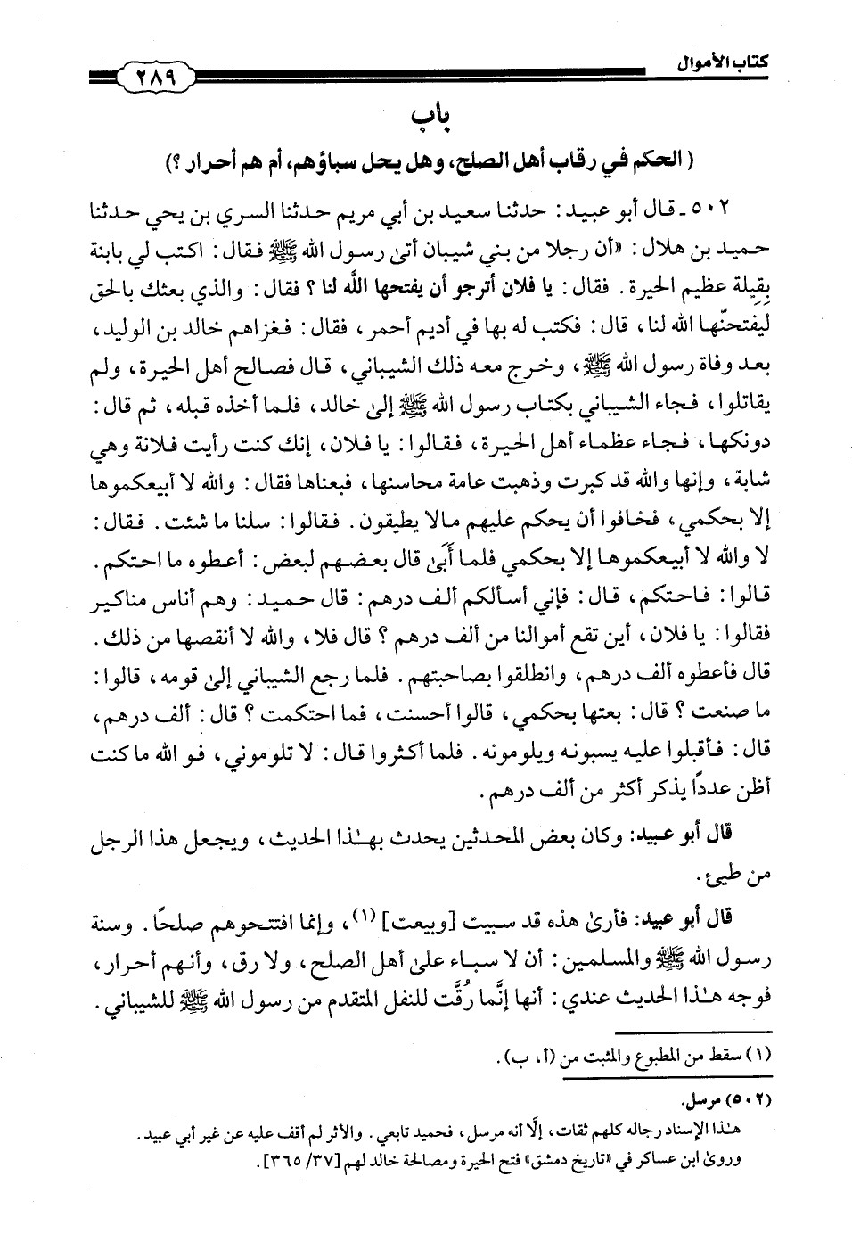 502 - (488) قَالَ أَبُو عُبَيْدٍ: حَدَّثَنَا سَعِيدُ بْنُ أَبِي مَرْيَمَ، حَدَّثَنَا السَّرِيُّ بْنُ يَحْيَى، حَدَّثَنَا حُمَيْدُ بْنُ هِلَالٍ، أَنَّ رَجُلًا مِنْ بَنِي شَيْبَانَ أَتَى رَسُولَ اللَّهِ صَلَّى اللهُ عَلَيْهِ وَسَلَّمَ، فَقَالَ: اكْتُبْ لِي بِابْنَةِ بَقِيلَةَ عَظِيمِ الْحِيرَةِ فَقَالَ: «يَا فُلَانُ أَتَرْجُو أَنْ يَفْتَحَهَا اللَّهُ لَنَا؟» فَقَالَ: وَالَّذِي بَعَثَكَ بِالْحَقِّ لَيَفْتَحَنَّهَا اللَّهُ لَنَا، قَالَ: فَكَتَبَ لَهُ بِهَا فِي أَدِيمٍ أَحْمَرَ فَقَالَ: فَغَزَاهُمْ خَالِدُ بْنُ الْوَلِيدِ بَعْدَ وَفَاةِ رَسُولِ اللَّهِ صَلَّى اللهُ عَلَيْهِ وَسَلَّمَ، وَخَرَجَ مَعَهُ ذَلِكَ الشَّيْبَانِيُّ، قَالَ: فَصَالَحَ أَهْلُ الْحِيرَةِ، وَلَمْ يُقَاتِلُوا، فَجَاءَ الشَّيْبَانِيُّ بِكِتَابِ رَسُولِ اللَّهِ صَلَّى اللهُ عَلَيْهِ وَسَلَّمَ إِلَى خَالِدٍ، فَلَمَّا أَخَذَهُ قَبَّلَهُ، ثُمَّ قَالَ: دُونَكَهَا فَجَاءَ عُظَمَاءُ أَهْلِ الْحِيرَةِ، فَقَالُوا: يَا فُلَانُ، إِنَّكَ كُنْتَ رَأَيْتَ فُلَانَةَ وَهِيَ شَابَّةٌ، وَإِنَّهَا وَاللَّهِ قَدْ كَبِرَتْ وَذَهَبَتْ عَامَّةُ مَحَاسِنَهَا، فَبِعْنَاهَا، فَقَالَ: وَاللَّهِ لَا أَبِيعُكُمُوهَا إِلَّا بِحُكْمِي فَخَافُوا أَنْ يَحْكُمَ عَلَيْهِمْ مَا لَا يُطِيقُونَ، فَقَالُوا: سَلْنَا مَا شِئْتَ، فَقَالَ: لَا وَاللَّهِ لَا أَبِيعُكُمُوهَا إِلَّا بِحُكْمِي، فَلَمَّا أَبَى قَالَ بَعْضُهُمْ لِبَعْضٍ: أَعْطُوهُ مَا احْتَكَمَ، قَالُوا: فَاحْتَكِمْ، قَالَ: فَإِنِّي أَسْأَلُكُمْ أَلْفَ دِرْهَمٍ: قَالَ حُمَيْدٌ وَهُمْ أُنَاسٌ مَنَاكِيرُ، فَقَالُوا: يَا فُلَانُ، أَيْنَ تَقَعُ أَمْوَالُنَا مِنْ أَلْفِ دِرْهَمٍ؟ قَالَ: فَلَا وَاللَّهِ لَا أَنْقُصُهَا مِنْ ذَلِكَ، قَالَ فَأَعْطَوْهُ أَلْفَ دِرْهَمٍ، وَانْطَلَقُوا بِصَاحِبَتِهِمْ فَمَا رَجَعَ الشَّيْبَانِيُّ إِلَى قَوْمِهِ، قَالُوا: مَا صَنَعْتَ؟ قَالَ: بِعْتُهَا بِحُكْمِي، قَالُوا: أَحْسَنْتَ، فَمَا احْتَكَمْتَ؟ قَالَ: أَلْفُ دِرْهَمٍ، قَالَ: فَأَقْبَلُوا عَلَيْهِ يَسُبُّونَهُ وَيَلُومُونَهُ، فَلَمَّا أَكْثَرُوا قَالَ: لَا تَلُومُونِي، فَوَاللَّهِ مَا كُنْتُ أَظُنُّ عَدَدًا يُذْكَرُ أَكْثَرَ مِنْ أَلْفِ دِرْهَمٍ.
