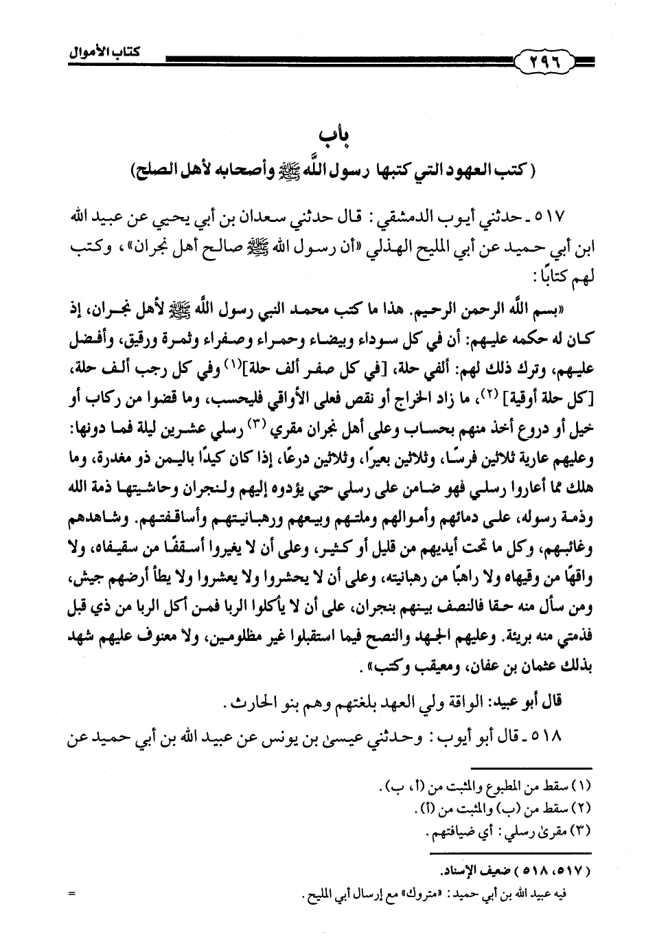 517 - (503) حَدَّثَنِي أَيُّوبُ الدِّمَشْقِيُّ، قَالَ: حَدَّثَنِي سَعْدَانُ بْنُ أَبِي يَحْيَى، عَنْ عُبَيْدِ اللَّهِ بْنِ أَبِي حُمَيْدٍ، عَنْ أَبِي الْمَلِيحِ الْهُذَلِيِّ، أَنَّ رَسُولَ اللَّهِ صَلَّى اللهُ عَلَيْهِ وَسَلَّمَ صَالَحَ أَهْلَ نَجْرَانَ، وَكَتَبَ لَهُمْ كِتَابًا: " بِسْمِ اللَّهِ الرَّحْمَنِ الرَّحِيمِ هَذَا مَا كَتَبَ مُحَمَّدٌ النَّبِيُّ رَسُولُ اللَّهِ صَلَّى اللهُ عَلَيْهِ وَسَلَّمَ لِأَهْلِ نَجْرَانَ، إِذْ كَانَ لَهُ حُكْمُهُ عَلَيْهِمْ: أَنَّ فِي كُلِّ سَوْدَاءَ وَبَيْضَاءَ وَحَمْرَاءَ وَصَفْرَاءَ وَثَمَرَةٍ وَرَقِيقٍ، وَأَفْضَلَ عَلَيْهِمْ، وَتَرَكَ ذَلِكَ لَهُمْ: أَلْفَيْ حُلَّةٍ، في كل صفر ألف حلة، وَفِي كُلِّ رَجَبٍ أَلْفُ حُلَّةٍ كُلُّ حُلَّةٍ أُوقِيَّةٌ، مَا زَادَ الْخَرَاجُ أَوْ نَقَصَ فَعَلَى الْأَوَاقِي فَلْيُحْسَبْ، وَمَا قَضَوْا مِنْ رِكَابٍ أَوْ خَيْلٍ أَوْ دُرُوعٍ أُخِذَ مِنْهُمْ بِحِسَابٍ، وَعَلَى أَهْلِ نَجْرَانَ مَقْرَى رُسُلِي عِشْرِينَ لَيْلَةً فَمَا دُونَهَا، وَعَلَيْهِمْ عَارِيَةُ ثَلَاثِينَ فَرَسًا، وَثَلَاثِينَ بَعِيرًا، وَثَلَاثِينَ دِرْعًا، إِذَا كَانَ كَيْدًا بِالْيَمَنِ ذُو مَغْدَرَةٍ، وَمَا هَلَكَ مِمَّا أَعَارُوا رُسُلِي فَهُوَ ضَامِنٌ عَلَى رُسُلِي حَتَّى يُؤَدُّوهُ إِلَيْهِمْ. وَلِنَجْرَانَ وَحَاشِيَتِهَا ذِمَّةُ اللَّهِ وَذِمَّةُ رَسُولِهِ، عَلَى دِمَائِهِمْ وَأَمْوَالِهِمْ وَمِلَّتِهِمْ وَبِيَعِهِمْ وَرَهْبَانِيَّتِهِمْ وَأَسَاقِفَتِهِمْ، وَشَاهِدِهِمْ وَغَائِبِهِمْ، وَكُلِّ مَا تَحْتَ أَيْدِيهِمْ مِنْ قَلِيلٍ أَوْ كَثِيرٍ، وَعَلَى أَنْ لَا يُغَيِّرُوا أُسْقُفًّا مِنْ سَقِيفَاهُ وَلَا وَاقِهًا مِنْ وَقِيهَاهُ، وَلَا رَاهِبًا مِنْ رَهْبَانِيَّتِهِ، وَعَلَى أَنْ لَا يُحْشَرُوا وَلَا يُعْشَرُوا وَلَا يَطَأَ أَرْضَهُمْ جَيْشٌ، وَمَنْ سَأَلَ مِنْهُ حَقًّا فَالنِّصْفُ بَيْنَهُمْ بِنَجْرَانَ، عَلَى أَنْ لَا يَاكُلُوا الرِّبَا فَمَنْ أَكَلَ الرِّبَا مِنْ ذِي قَبْلُ فَذِمَّتِي مِنْهُ بَرِيئَةٌ وَعَلَيْهِمُ الْجَهْدُ وَالنُّصْحُ فِيمَا اسْتَقْبَلُوا غَيْرَ مَظْلُومِينَ، وَلَا مَعْنُوفٍ عَلَيْهِمْ «، شَهِدَ بِذَلِكَ عُثْمَانُ بْنُ عَفَّانَ، وَمُعَيْقِبٌ، وَكُتِبَ»