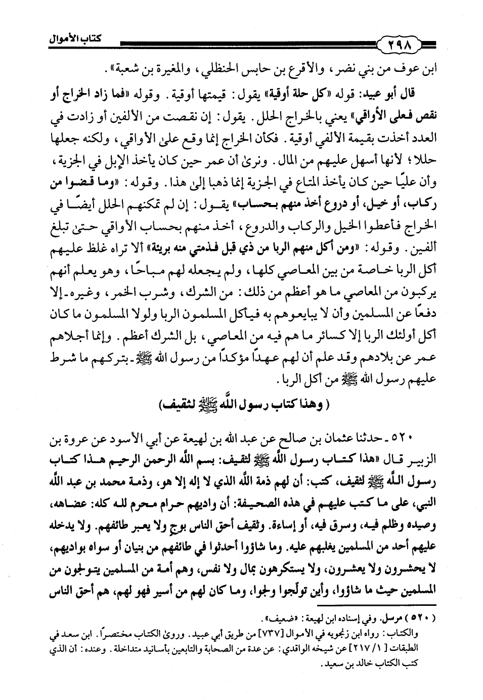 520 - (507) حَدَّثَنَا عُثْمَانُ بْنُ صَالِحٍ، عَنْ عَبْدِ اللَّهِ بْنِ لَهِيعَةَ، عَنْ أَبِي الْأَسْوَدِ، عَنْ عُرْوَةَ بْنِ الزُّبَيْرِ، قَالَ: هَذَا كِتَابُ رَسُولِ اللَّهِ صَلَّى اللهُ عَلَيْهِ وَسَلَّمَ لِثَقِيفٍ: بِسْمِ اللَّهِ الرَّحْمَنِ الرَّحِيمِ هَذَا كِتَابُ رَسُولِ اللَّهِ صَلَّى اللهُ عَلَيْهِ وَسَلَّمَ لِثَقِيفٍ، كَتَبَ أَنَّ لَهُمُ ذِمَّةَ اللَّهِ الَّذِي لَا إِلَهَ إِلَّا هُوَ، وَذِمَّةُ مُحَمَّدِ بْنِ عَبْدِ اللَّهِ النَّبِيِّ، عَلَى مَا كَتَبَ عَلَيْهِمْ فِي هَذِهِ الصَّحِيفَةِ: أَنَّ وَادِيَهُمْ حَرَامٌ مُحَرَّمٌ لِلَّهِ كُلِّهِ: عِضَاهُهُ وَصَيْدُهُ، وَظُلْمٌ فِيهِ، وَسَرَقٌ فِيهِ، أَوْ إِسَاءَةٌ، وَثَقْيفٌ أَحَقُّ النَّاسِ بِوَجٍّ، وَلَا يَعْبُرُ طَائِفُهُمْ، وَلَا يَدْخُلُهُ عَلَيْهِمْ أَحَدٌ مِنَ الْمُسْلِمِينَ يَغْلِبُهُمْ عَلَيْهِ، وَمَا شَاءُوا أَحْدَثُوا فِي طَائِفِهِمْ مِنْ بُنْيَانٍ أَوْ سِوَاهُ بِوَادِيهِمْ، لَا يُحْشَرُونَ وَلَا يُعْشَرُونَ، وَلَا يُسْتَكْرَهُونَ بِمَالٍ وَلَا نَفْسٍ، وَهُمْ أُمَّةٌ مِنَ الْمُسْلِمِينَ يِتَوَلَّجُونَ مِنَ الْمُسْلِمِينَ حَيْثُ مَا شَاءُوا، وَأَيْنَ تَوَلَّجُوا وَلَجُوا، وَمَا كَانَ لَهُمْ مِنْ أَسِيرٍ فَهُوَ لَهُمْ، هُمْ أَحَقُّ النَّاسِ #299# بِهِ حَتَّى يَفْعَلُوا بِهِ مَا شَاءُوا، وَمَا كَانَ لَهُمْ مِنْ دَيْنٍ فِي رَهْنٍ فَبَلَغَ أَجَلَهُ فَإِنَّهُ لِوَاطٌ مُبَرَّأٌ مِنَ اللَّهِ - وَفِي حَدِيثٍ يُرْوَى عَنِ ابْنِ إِسْحَاقَ فَإِنَّهُ لِيَاطٌ مُبَرَّأٌ مِنَ اللَّهِ - وَمَا كَانَ مِنْ دَيْنِ فِي رَهْنٍ وَرَاءَ عُكَاظٍ فَإِنَّهُ يُقْضَى إِلَى عُكَاظٍ بِرَاسِهِ وَمَا كَانَ لِثَقِيفٍ مِنْ دَيْنِ فِي صُحُفِهِمُ الْيَوْمَ الَّذِي أَسْلَمُوا عَلَيْهِ فِي النَّاسِ، فَإِنَّهُ لَهُمْ وَمَا كَانَ لِثَقِيفٍ مِنْ وَدِيعَةٍ فِي النَّاسِ، أَوْ مَالٍ، أَوْ نَفْسٍ غَنَمِهَا مُودِعُهَا، أَوْ أَضَاعَهَا، أَلَا فَإِنَّهَا مُؤَدَّاةٌ، وَمَا كَانَ لِثَقِيفٍ مِنْ نَفْسٍ غَائِبَةٍ أَوْ مَالٍ، فَإِنَّ لَهُ مِنَ الْأَمْنِ مَا لِشَاهِدِهِمْ، وَمَا كَانَ لَهُمْ مِنْ مَالٍ بِلِيَّةَ، فَإِنَّ لَهُ مِنَ الْأَمْنِ مَا لَهُمْ بِوَجٍّ، وَمَا كَانَ لِثَقِيفٍ مِنْ حَلِيفٍ، أَوْ تَاجِرٍ، فَأَسْلَمَ فَإِنَّ لَهُ مِثْلَ قَضِيَّةِ أَمْرِ ثَقِيفٍ وَإِنْ طَعَنَ طَاعِنٌ عَلَى ثَقِيفٍ، أَوْ ظَلَمَهُمْ ظَالِمٌ، فَإِنَّهُ لَا يُطَاعُ فِيهِمْ فِي مَالٍ وَلَا نَفْسٍ وَإِنَّ الرَّسُولَ يَنْصُرُهُمْ عَلَى مَنْ ظَلَمَهُمْ، وَالْمُؤْمِنُونَ وَمَنْ كَرِهُوا أَنْ يَلِجَ عَلَيْهِمْ مِنَ النَّاسِ فَإِنَّهُ لَا يَلِجُ عَلَيْهِمْ، وَإِنَّ السُّوقَ وَالْبَيْعَ بِأَفْنِيَةِ الْبُيُوتِ، وَأَنه لَا يُؤَمَّرَ عَلَيْهِمْ إِلَّا بَعْضُهُمْ عَلَى بَعْضٍ: عَلَى بَنِي مَالِكٍ أَمِيرُهُمْ، وَعَلَى الْأَخْلَافِ أَمِيرُهُمْ، وَمَا سَقَتْ ثَقِيفٌ مِنْ أَعْنَابِ قُرَيْشٍ فَإِنَّ شَطْرَهَا لِمَنْ سَقَاهَا وَمَا كَانَ لَهُمْ مِنْ دَيْنِ فِي رَهْنَ لَمْ يَلِطْ فَإِنْ وَجَدَ أَهْلُهُ قَضَاءً قَضَوْا، وَإِنْ لَمْ يَجِدُوا قَضَاءً فَإِنَّهُ إِلَى جُمَادَى الْأُولَى مِنْ عَامِ قَابِلٍ، مَنْ بَلَغَ أَجَلُهُ فَلَمْ يَقْضِهِ فَإِنَّهُ قَدْ لَاطَهُ، وَمَا كَانَ لَهُمْ مِنَ النَّاسِ مِنْ دَيْنٍ فَلَيْسَ عَلَيْهِمْ إِلَّا رَاسُهُ وَمَا كَانَ لَهُمْ مِنْ أَسِيرٍ بَاعَهُ رَبُّهُ، فَإِنَّ لَهُ بَيْعَهُ، ومَا لَمْ يَبِعْ فَإِنَّ فِيهِ سِتَّ قَلَائِصَ نِصْفَيْنِ - قَالَ أَبُو عُبَيْدٍ: فِي الْكِتَابِ نِصْفَانِ - حِقَاقٌ وَبَنَاتُ لَبُونٍ كِرَامٌ سِمَانٌ وَمَنْ كَانَ لَهُ بَيْعٌ اشْتَرَاهُ فَإِنَّ لَهُ بَيْعَهُ.