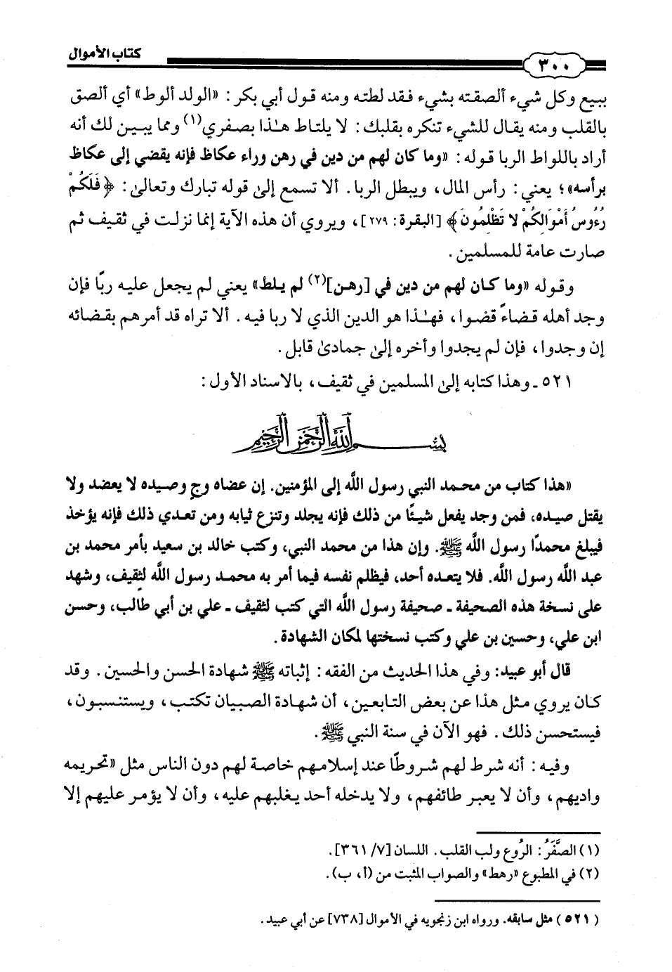بِسْمِ اللَّهِ الرَّحْمَنِ الرَّحِيمِ، هَذَا كِتَابٌ مِنْ مُحَمَّدٍ النَّبِيِّ رَسُولِ اللَّهِ إِلَى الْمُؤْمِنِينَ: إِنَّ عِضَاهَ وَجٍّ وَصَيْدَهُ لَا يُعْضَدُ وَلَا يُقْتَلُ صَيْدُهُ، فَمَنْ وُجِدَ يَفْعَلُ شَيْئًا مِنْ ذَلِكَ فَإِنَّهُ يُجْلَدُ وَتُنْزَعُ ثِيَابُهُ، وَمَنْ تَعَدَّى ذَلِكَ فَإِنَّهُ يُؤْخَذُ فَيُبَلِّغُ مُحَمَّدًا رَسُولَ اللَّهِ صَلَّى اللهُ عَلَيْهِ وَسَلَّمَ، وَإِنَّ هَذَا مِنْ مُحَمَّدٍ النَّبِيِّ وَكَتَبَ خَالِدُ بْنُ سَعِيدٍ بِأَمْرِ مُحَمَّدِ بْنِ عَبْدِ اللَّهِ رَسُولِ اللَّهِ فَلَا يَتَعَدَّهُ أَحَدٌ، فَيَظْلِمْ نَفْسَهُ فِيمَا أَمَرَ بِهِ مُحَمَّدٌ رَسُولُ اللَّهِ لِثَقِيفٍ، وَشَهِدَ عَلَى نُسْخَةِ هَذِهِ الصَّحِيفَةِ صَحِيفَةِ رَسُولِ اللَّهِ الَّتِي كَتَبَ لِثَقِيفٍ عَلِيُّ بْنُ أَبِي طَالِبٍ، وَحَسَنُ بْنُ عَلِيٍّ، وَحُسَيْنُ بْنُ عَلِيٍّ، وَكَتَبَ نُسْخَتَهَا لِمَكَانِ الشَّهَادَةِ قَالَ أَبُو عُبَيْدٍ: وَفِي هَذَا الْحَدِيثِ مِنَ الْفِقْهِ: إِثْبَاتُهُ صَلَّى اللهُ عَلَيْهِ وَسَلَّمَ شَهَادَةَ الْحَسَنِ وَالْحُسَيْنِ، وَقَدْ كَانَ يُرْوَى مِثْلُ هَذَا عَنْ بَعْضِ التَّابِعِينَ، أَنَّ شَهَادَةَ الصِّبْيَانِ تُكْتَبُ، وَيُسْتَنْسَبُونَ، فَيُسْتَحْسَنُ ذَلِكَ فَهُوَ الْآنَ فِي سُنَّةِ النَّبِيِّ صَلَّى اللهُ عَلَيْهِ وَسَلَّمَ وَفِيهِ: أَنَّهُ شَرَطَ لَهُمْ شُرُوطًا عِنْدَ إِسْلَامِهِمْ خَاصَّةً لَهُمْ دُونَ النَّاسِ مِثْلَ تَحْرِيمِهِ وَادِيَهُمْ، وَأَنْ لَا يُعْبَرُ طَائِفُهُمْ، وَلَا يَدْخُلَهُ أَحَدٌ يَغْلِبُهُمْ عَلَيْهِ، وَأَنْ لَا يُؤَمَّرَ عَلَيْهِمْ إِلَّا #301# بَعْضُهُمُ، وَهَذَا مِمَّا قُلْتُ لَكَ: إِنَّ الْإِمَامَ نَاظِرٌ لِلْإِسْلَامِ وَأَهْلِهِ، فَإِذَا خَافَ مِنْ عَدُوٍّ غَلَبَهُ لَا يَقْدِرُ عَلَى دَفْعِهِمْ إِلَّا بِعَطِيَّةٍ يَرُدُّهُمْ بِهَا فَعَلَ، كَالَّذِي صَنَعَ النَّبِيُّ صَلَّى اللهُ عَلَيْهِ وَسَلَّمَ بِالْأَحْزَابِ يَوْمَ الْخَنْدَقِ، وَكَذَلِكَ لَوْ أَبَوْا أَنْ يُسْلِمُوا إِلَّا عَلَى شَيْءٍ يَجْعَلُهُ لَهُمْ، وَكَانَ فِي إِسْلَامِهِمْ عِزٌّ لِلْإِسْلَامِ، وَلَمْ يَامَنْ مَعَرَّتَهُمْ وَبَاسَهُمْ أَعْطَاهُمْ ذَلِكَ لِيَتَأَلَّفَهُمْ بِهِ، كَمَا فَعَلَ رَسُولُ اللَّهِ صَلَّى اللهُ عَلَيْهِ وَسَلَّمَ بِالْمُؤَلَّفَةِ قُلُوبُهُمْ، إِلَى أَنْ يَرْغَبُوا فِي الْإِسْلَامِ وَتَحْسُنُ فِيهِ نِيَّتَهُمْ، وَإِنَّمَا يَجُوزُ مِنْ هَذَا مَا لَمْ يَكُنْ فِيهِ نَقْضٌ لِلْكِتَابِ وَلَا لِلسُّنَّةِ، وَيُبَيِّنُ ذَلِكَ أَنَّ رَسُولَ اللَّهِ صَلَّى اللهُ عَلَيْهِ وَسَلَّمَ لَمْ يَجْعَلْ لَهُمْ فِيمَا أَعْطَاهُمْ تَحْلِيلَ الرِّبَا. أَلَا تَرَاهُ قَدِ اشْتَرَطَ عَلَيْهِمْ أَنَّ لَهُمُ رُءُوسَ أَمْوَالِهِمْ؟ هَذَا وَإِنَّمَا كَانَ أَصْلُهُ فِي الْجَاهِلِيَّةِ فَهُوَ إِذَا كَانَ ابْتِدَاؤُهُ فِي الْإِسْلَامِ أَشَدَّ تَحْرِيمًا وَأَحْرَى أَنْ لَا يَجُوزَ، وَقَدْ رُوِيَ فِي بَعْضِ الْحَدِيثِ: أَنَّهُمْ كَانُوا سَأَلُوهُ قَبْلَ ذَلِكَ أَنْ يُسْلِمُوا عَلَى تَحْلِيلِ الزِّنَا وَالرِّبَا وَالْخَمْرِ، فَأَبَى ذَلِكَ عَلَيْهِمْ فَرَجَعُوا إِلَى بِلَادِهِمْ ثُمَّ عَادُوا إِلَيْهِ رَاغِبِينَ فِي الْإِسْلَامِ، فَكَتَبَ لَهُمْ هَذَا الْكِتَابَ.
