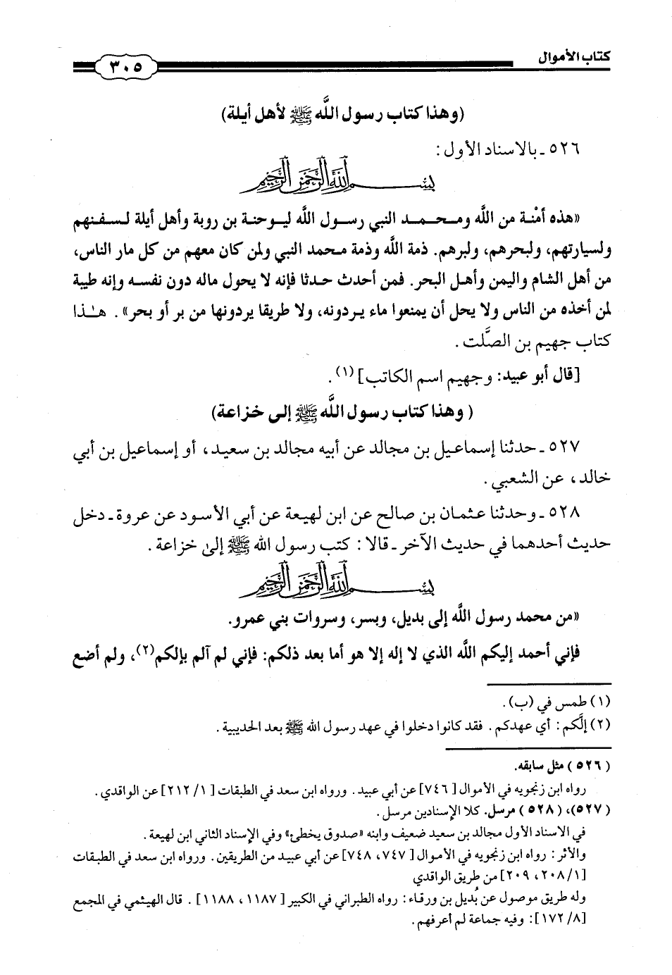526 - (514) بِالْإِسْنَادِ الْأَوَّلِ: «بِسْمِ اللَّهِ الرَّحْمَنِ الرَّحِيمِ، هَذِهِ أَمَنَةٌ مِنَ اللَّهِ وَمُحَمَّدٍ النَّبِيِّ رَسُولِ اللَّهِ لِيُوحَنَّةَ بْنِ رُوبَةَ وَأَهْلِ أَيْلَةَ لِسُفُنِهِمْ، وَلِسَيَّارَتِهِمْ وَلِبَحْرِهِمْ وَلِبَرِّهِمْ، ذِمَّةَ اللَّهِ وَذِمَّةَ مُحَمَّدٍ النَّبِيِّ، وَلِمَنْ كَانَ مَعَهُمْ مِنْ كُلِّ مَارِّ النَّاسِ، مِنْ أَهْلِ الشَّامِ وَالْيَمَنِ وَأَهْلِ الْبَحْرِ، فَمَنْ أَحْدَثَ حَدَثًا فَإِنَّهُ لَا يَحُولُ مَالُهُ دُونَ نَفْسِهِ، وَإِنَّهُ طِيبَةٌ لِمَنْ أَخَذَهُ مِنَ النَّاسِ، وَلَا يَحِلُّ أَنْ يُمْنَعُوا مَاءً يَرِدُونَهُ، وَلَا طَرِيقًا يَرِدُونَهَا مِنْ بَرٍّ أَوْ بَحْرٍ» هَذَا كِتَابُ جُهَيْمِ بْنِ الصَّلْتِ قَالَ أَبُو عُبَيْدٍ وَجُهَيْمٌ اسْمُ الْكَاتِبِ.