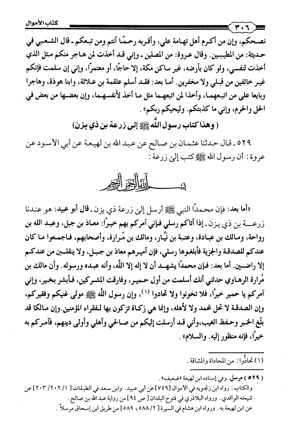 529 - (517) قَالَ: حَدَّثَنَا عُثْمَانُ بْنُ صَالِحٍ، عَنْ عَبْدِ اللَّهِ بْنِ لَهِيعَةَ، عَنْ أَبِي الْأَسْوَدِ، عَنْ عُرْوَةَ، أَنَّ رَسُولَ اللَّهِ صَلَّى اللهُ عَلَيْهِ وَسَلَّمَ كَتَبَ إِلَى زُرْعَةَ: بِسْمِ اللَّهِ الرَّحْمَنِ الرَّحِيمِ، أَمَّا بَعْدُ، فَإِنَّ مُحَمَّدًا النَّبِيَّ صَلَّى اللهُ عَلَيْهِ وَسَلَّمَ أَرْسَلَ إِلَى زُرْعَةَ ذِي يَزِنٍ - قَالَ أَبُو عُبَيْدٍ: هُوَ عِنْدَنَا زُرْعَةُ بْنُ ذِي يَزِنٍ - إِذَا أَتَاكُمْ رُسُلِي فَإِنِّي آمُرُكُمْ بِهِمْ خَيْرًا: مُعَاذُ بْنُ جَبَلٍ، وَعَبْدُ اللَّهِ بْنُ رَوَاحَةَ، وَمَالِكُ بْنُ عُبَادَةَ، وَعُتْبَةُ بْنُ نِيَارٍ، وَمَالِكُ بْنُ مُرَارَةَ، وَأَصْحَابُهُمْ، فَاجْمَعُوا مَا كَانَ عِنْدَكُمْ لِلصَّدَقَةِ وَالْجِزْيَةِ فَأَبْلِغُوَهَا رُسُلِي، فَإِنَّ أَمِيرَهُمْ مُعَاذُ بْنُ جَبَلٍ، وَلَا يَنْقَلِبُنَّ مِنْ عِنْدِكُمْ إِلَّا رَاضِينَ. أَمَّا بَعْدُ: فَإِنَّ مُحَمَّدًا يَشْهَدُ أَنْ لَا إِلَهَ إِلَّا اللَّهُ، وَأَنَّهُ عَبْدُهُ وَرَسُولُهُ وَأَنَّ مَالِكَ بْنَ مُرَارَةَ الرَّهَاوِيَّ حَدَّثَنِي أَنَّكُ أَسْلَمْتَ مِنْ أَوَّلِ حِمْيَرَ، وَفَارَقْتَ الْمُشْرِكِينَ، فَأَبْشِرْ بِخَيْرٍ، وَإِنِّي آمُرُكُمْ يَا حِمْيَرُ خَيْرًا، فَلَا تَخُونُوا وَلَا تُحَادُّوا، وَإِنَّ رَسُولَ اللَّهِ صَلَّى اللهُ عَلَيْهِ وَسَلَّمَ مَوْلَى غَنِيِّكُمْ وَفَقِيرِكُمْ، وَإِنَّ الصَّدَقَةَ لَا تَحِلُّ لِمُحَمَّدٍ وَلَا لِأَهْلِهِ، وَإِنَّمَا هِيَ زَكَاةٌ تُزَكُّونَ بِهَا لِفُقَرَاءِ الْمُؤْمِنِينَ وَإِنَّ مَالِكًا قَدْ بَلَّغَ الْخَبَرَ وَحِفِظَ الْغَيْبَ، وَإِنِّي قَدْ أَرْسَلْتُ إِلَيْكُمْ مِنْ صَالِحِي وَأَهْلِي وَأُولِي دِينِهِمْ فَآمُرُكُمْ بِهِ خَيْرًا، فَإِنَّهُ مَنْظُورٌ إِلَيْهِ وَالسَّلَامُ #307# وَقَالَ أَبُو عُبَيْدٍ: أُرَاهُ يَعْنِي مُعَاذَ بْنَ جَبَلٍ.