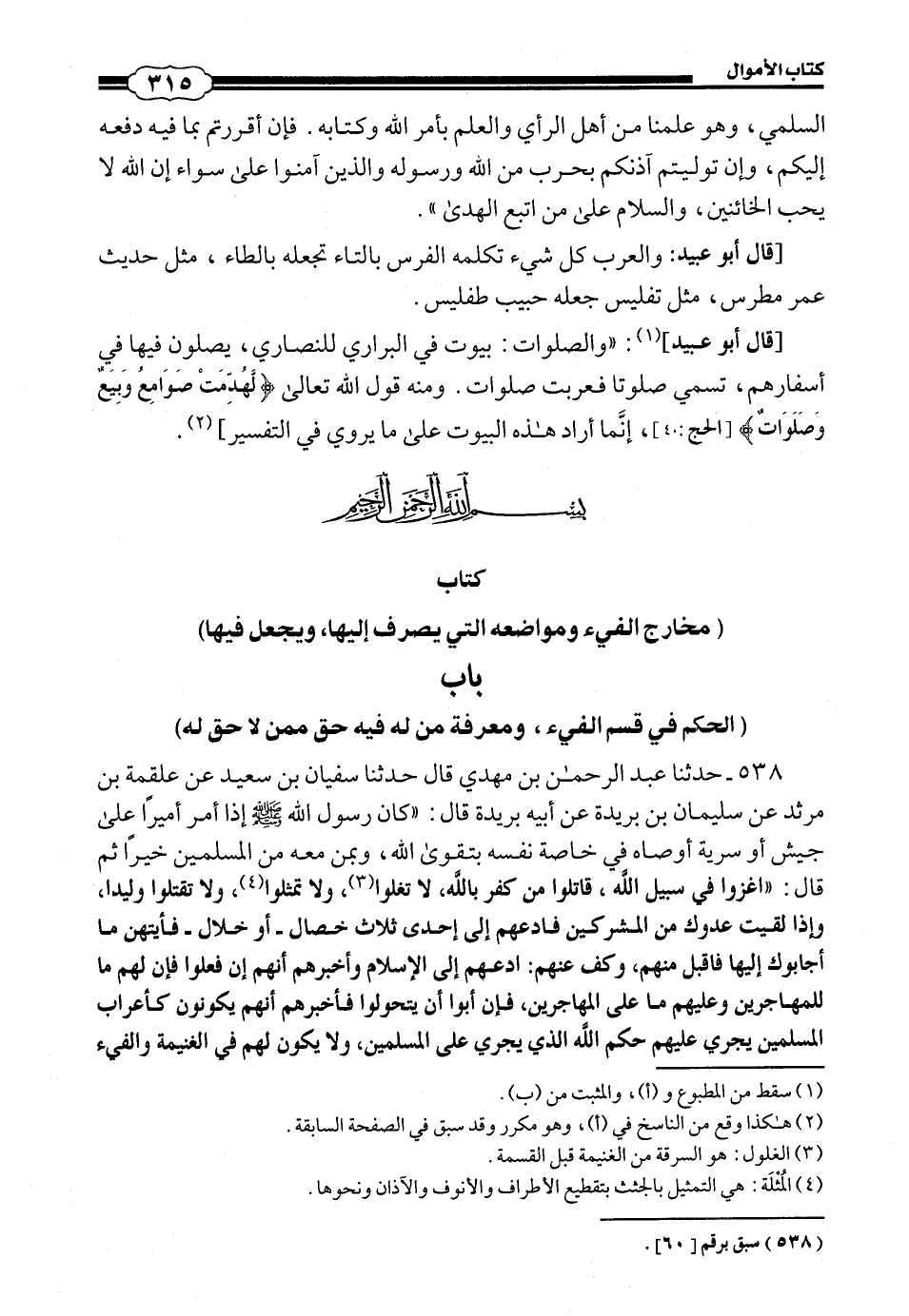 538 - (524) حَدَّثَنَا عَبْدُ الرَّحْمَنِ بْنُ مَهْدِيِّ، قَالَ: حَدَّثَنَا سُفْيَانُ بْنُ سَعِيدٍ، عَنْ عَلْقَمَةَ بْنِ مَرْثَدٍ، عَنْ سُلَيْمَانَ بْنِ بُرَيْدَةَ، عَنْ أَبِيهِ بُرَيْدَةَ، قَالَ: كَانَ رَسُولُ اللَّهِ صَلَّى اللهُ عَلَيْهِ وَسَلَّمَ إِذَا أَمَّرَ أَمِيرًا عَلَى جَيْشٍ أَوْ سَرِيَّةٍ أَوْصَاهُ فِي خَاصَّةِ نَفْسِهِ بِتَقْوَى اللَّهِ، وَبِمَنْ مَعَهُ مِنَ الْمُسْلِمِينَ خَيْرًا، ثُمَّ قَالَ: اغْزُوا فِي سَبِيلِ اللَّهِ، قَاتِلُوا مَنْ كَفَرَ بِاللَّهِ، لَا تَغُلُّوا، وَلَا تُمَثِّلُوا، وَلَا تَقْتُلُوا وَلِيدًا، وَإِذَا لَقِيتَ عَدُوَّكَ مِنَ الْمُشْرِكِينَ فَادْعُهُمْ إِلَى إِحْدَى ثَلَاثِ خِصَالٍ أَوْ خِلَالٍ فَأَيَّتُهُنَّ مَا أَجَابُوكَ إِلَيْهَا فَاقْبَلْ مِنْهُمْ، وَكُفَّ عَنْهُمُ: ادْعُهُمْ إِلَى الْإِسْلَامِ وَأَخْبِرْهُمْ أَنَّهُمْ إِنْ فَعَلُوا فَإِنَّ لَهُمْ مَا لِلْمُهَاجِرِينَ وَعَلَيْهِمْ مَا عَلَى الْمُهَاجِرِينَ، فَإِنْ أَبَوْا أَنْ يَتَحَوَّلُوا فَأَخْبِرْهُمْ أَنَّهُمْ يَكُونُونَ كَأَعْرَابِ الْمُسْلِمِينَ يَجْرِي عَلَيْهِمْ حُكْمُ اللَّهِ الَّذِي يَجْرِي عَلَى الْمُسْلِمِينَ، وَلَا يَكُونُ لَهُمْ فِي الْغَنِيمَةِ وَالْفَيْءِ #316# شَيْءٌ إِلَّا أَنْ يُجَاهِدُوا مَعَ الْمُسْلِمِينَ، فَإِنْ هُمْ أَبَوْا فَسَلْهُمُ الْجِزْيَةَ فَإِنْ هُمْ أَجَابُوكَ فَاقْبَلْ مِنْهُمْ، وَكُفَّ عَنْهُمْ، فَإِنْ هُمْ أَبَوْا فَاسْتَعِنْ بِاللَّهِ وَقَاتِلْهُمْ.