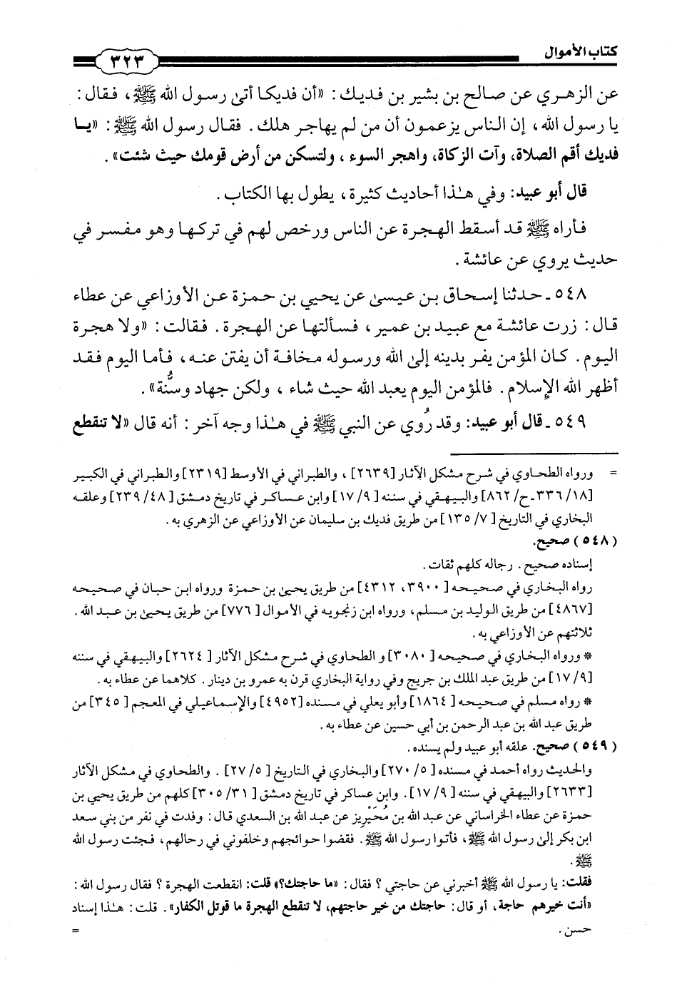 549 - (537) قَالَ أَبُو عُبَيْدٍ: وَقَدْ رُوِيَ عَنِ النَّبِيِّ صَلَّى اللهُ عَلَيْهِ وَسَلَّمَ فِي هَذَا وَجْهٌ آخَرُ: أَنَّهُ قَالَ: لَا تَنْقَطِعُ #324# الْهِجْرَةُ مَا قُوتِلَ الْكُفَّارُ.