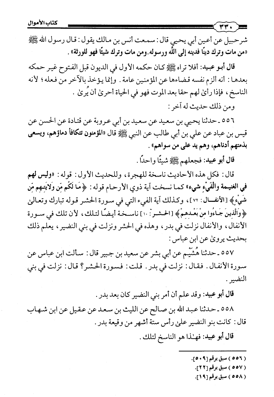 قَالَ أَبُو عُبَيْدٍ: فَجَعَلَهُمْ صَلَّى اللهُ عَلَيْهِ وَسَلَّمَ شَيْئًا وَاحِدًا، قَالَ: فَكُلُّ هَذِهِ الْأَحَادِيثِ نَاسِخَةٌ لِلْهِجْرَةِ، وَلِلْحَدِيثِ الْأَوَّلِ: قَوْلُهُ وَلَيْسَ لَهُمْ فِي الْغَنِيمَةِ وَالْفَيْءِ شَيْءٌ كَمَا نَسَخَتْ آيَةُ ذَوِي الْأَرْحَامِ قَوْلُهُ: {مَا لَكُمْ مِنْ وَلَايَتِهِمْ مِنْ شَيْءٍ} [الأنفال: 72] وَكَذَلِكَ آيَةُ الْفَيْءِ الَّتِي فِي سُورَةِ الْحَشْرِ، قَوْلُهُ تَبَارَكَ وَتَعَالَى {وَالَّذِينَ جَاءُوا مِنْ بَعْدِهِمْ} نَاسِخَةٌ أَيْضًا لِتِلْكَ، لِأَنَّ تِلْكَ فِي سُورَةِ الْأَنْفَالِ وَالْأَنْفَالُ نَزَلَتْ فِي بَدْرٍ، وَهَذِهِ فِي الْحَشْرِ، وَنَزَلَتِ الْحَشْرُ فِي بَنِي النَّضِيرِ. يُعْلَمُ ذَلِكَ بِحَدِيثٍ يُرْوَى عَنِ ابْنِ عَبَّاسٍ.