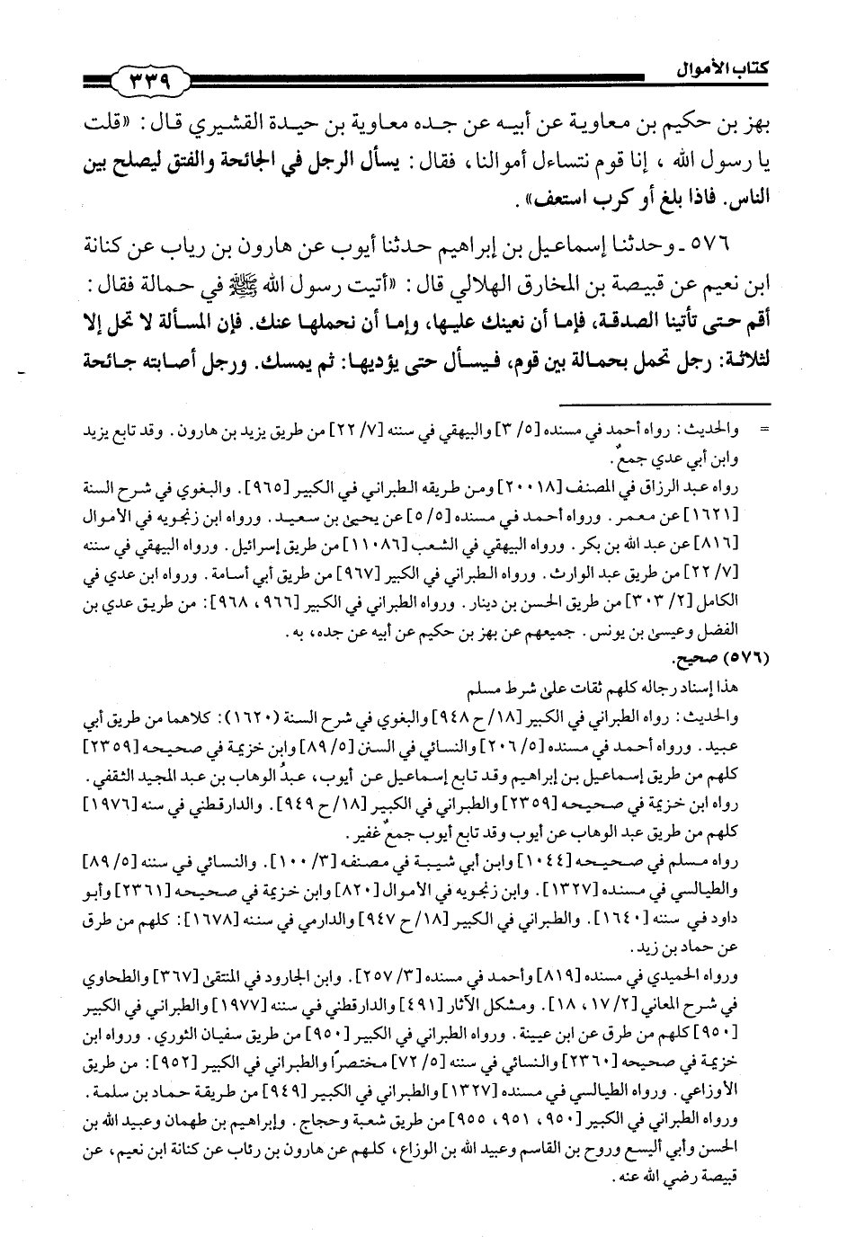 576 - (564) وَحَدَّثَنَا إِسْمَاعِيلُ بْنُ إِبْرَاهِيمَ، حَدَّثَنَا أَيُّوبُ، عَنْ هَارُونَ بْنِ رِيَابٍ، عَنْ كِنَانَةَ بْنِ نُعَيْمٍ، عَنْ قَبِيصَةَ بْنِ المُخَارِقٍ الْهِلَالِيِّ، قَالَ: أَتَيْتُ رَسُولَ اللَّهِ صَلَّى اللهُ عَلَيْهِ وَسَلَّمَ فِي حَمَالَةٍ، فَقَالَ: أَقِمْ حَتَّى تَاتِيَنَا الصَّدَقَةُ، فَإِمَّا أَنْ نُعِينَكَ عَلَيْهَا، وَإِمَّا أَنْ نَحْمِلَهَا عَنْكَ فَإِنَّ الْمَسْأَلَةَ لَا تَحِلُّ إِلَّا لِثَلَاثَةٍ: رَجُلٌ تَحَمَّلَ بِحَمَالَةٍ بَيْنَ قَوْمٍ، فَيَسْأَلُ حَتَّى يُؤَدِّيَهَا ثُمَّ يُمْسِكُ، وَرَجُلٌ أَصَابَتْهُ جَائِحَةٌ #340# فَاجْتَاحَتْ مَالَهُ، فَيَسْأَلُ حَتَّى يُصِيبَ قِوَامًا مِنْ عَيْشٍ أَوْ سَدَادًا مِنْ عَيْشٍ، ثُمَّ يُمْسِكُ، وَرَجُلٌ أَصَابَتْهُ فَاقَةٌ حَتَّى يَشْهَدَ لَهُ ثَلَاثَةٌ مِنْ ذَوِي الْحِجَى مِنْ قَوْمِهِ: أَنْ قَدْ أَصَابَتْهُ فَاقَةٌ، وَأَنْ قَدْ حَلَّتْ لَهُ الْمَسْأَلَةُ، فَيَسْأَلُ حَتَّى يُصِيبَ قِوَامًا مِنْ عَيْشٍ، أَوْ سَدَادًا مِنْ عَيْشٍ، ثُمَّ يُمْسِكُ، وَمَا سِوَى ذَلِكَ مِنَ الْمَسَائِلِ، سُحْتٌ يَاكُلُهُ صَاحِبُهُ يَا قَبِيصَةُ سُحْتًا.