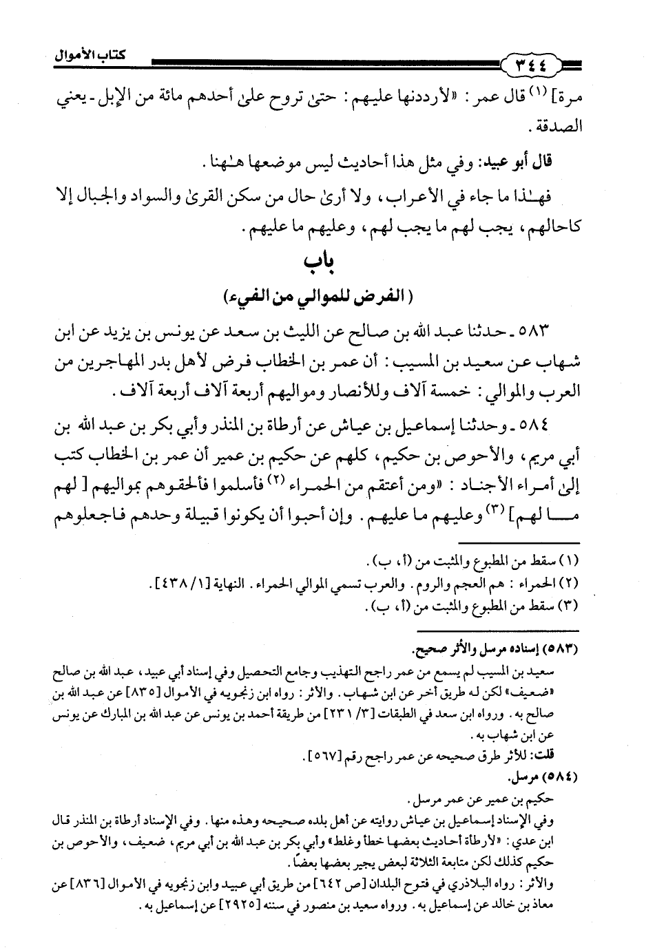 583 - (571) حَدَّثَنَا عَبْدُ اللَّهِ بْنُ صَالِحٍ، عَنِ اللَّيْثِ بْنِ سَعْدٍ، عَنْ يُونُسَ بْنِ يَزِيدَ، عَنِ ابْنِ شِهَابٍ، عَنْ سَعِيدِ بْنِ الْمُسَيِّبِ، أَنَّ عُمَرَ بْنَ الْخَطَّابِ " فَرَضَ لِأَهْلِ بَدْرٍ الْمُهَاجِرِينَ مِنَ الْعَرَبِ وَالْمَوَالِي: خَمْسَةَ آلَافٍ وَلِلْأَنْصَارِ وَمَوَالِيهِمْ أَرْبَعَةَ آلَافٍ أَرْبَعَةَ آلَافٍ ".