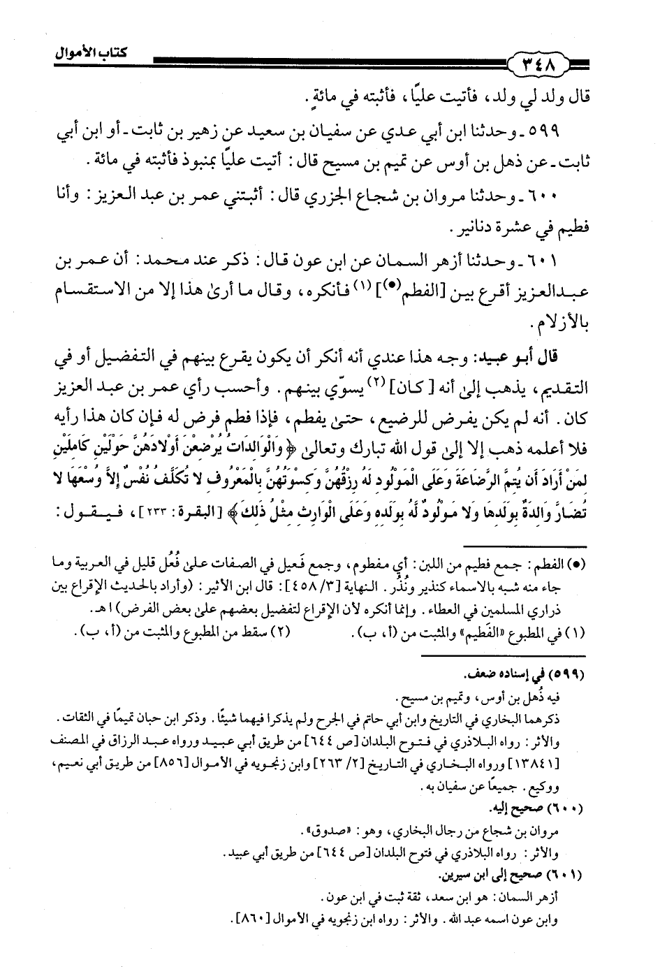 قَالَ أَبُو عُبَيْدٍ: وَجْهُ هَذَا عِنْدِي أَنَّهُ أَنْكَرَ أَنْ يَكُونَ يَقْرَعُ بَيْنَهُمْ فِي التَّفْضِيلِ أَوْ فِي التَّقْدِيمِ، يَذْهَبُ إِلَى أَنَّهُ كان يُسَوِّي بَيْنَهُمْ، وَأَحْسِبُ رَايَ عُمَرَ بْنِ عَبْدِ الْعَزِيزِ كَانَ أَنَّهُ لَمْ يَكُنْ يَفْرِضُ لِلرَّضِيعِ حَتَّى يُفْطَمَ، فَإِذَا فُطِمَ فَرَضَ لَهُ، فَإِنْ كَانَ هَذَا رَايَهُ فَلَا أَعْلَمُهُ ذَهَبَ إِلَّا إِلَى قَوْلِ اللَّهِ تَبَارَكَ وَتَعَالَى: {وَالْوَالِدَاتُ يُرْضِعْنَ أَوْلَادَهُنَّ حَوْلَيْنِ كَامِلَيْنِ لِمَنْ أَرَادَ أَنْ يُتِمَّ الرَّضَاعَةَ، وَعَلَى الْمَوْلُودِ لَهُ رِزْقُهُنَّ وَكِسْوَتُهُنَّ بِالْمَعْرُوفِ لَا تَكَلَّفُ نَفْسٌ إِلَّا وُسْعَهَا لَا تُضَارَّ وَالِدَةٌ بِوَلَدِهَا وَلَا مَوْلُودٌ لَهُ بِوَلَدِهِ وَعَلَى الْوَارِثِ مِثْلُ ذَلِكَ} [البقرة: 233] فَيَقُولُ: #349# رَضَاعُهُ عَلَى أَبِيهِ، فَإِنْ لَمْ يَكُنْ لَهُ أَبٌ فَعَلَى الْوَارِثِ إِذَا لَمْ يَكُنْ لِلصَّبِيِّ مَالٌ، فَإِنْ كَانَ لَهُ مَالٌ فَفِي مَالِهِ، وَقَدْ قَالَ بِهَذَا الْقَوْلِ غَيْرَ وَاحِدٍ مِنَ الْفُقَهَاءِ.