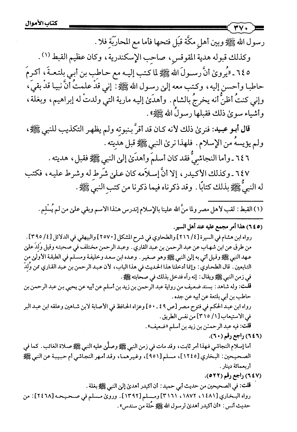 645 - (634) يُرْوَى أَنَّ رَسُولَ اللَّهِ صَلَّى اللهُ عَلَيْهِ وَسَلَّمَ لَمَّا كَتَبَ إِلَيْهِ مَعَ حَاطِبِ بْنِ أَبِي بَلْتَعَةَ، أَكْرَمَ حَاطِبًا وَأَحْسَنَ إِلَيْهِ، وَكَتَبَ مَعَهُ إِلَى رَسُولِ اللَّهِ صَلَّى اللهُ عَلَيْهِ وَسَلَّمَ: إِنِّي قَدْ عَلِمْتُ أَنَّ نَبِيًّا قَدْ بَقِيَ، وَإِنِّي كُنْتُ أَظُنُّ أَنَّهُ يَخْرُجُ بِالشَّامِ، وَأَهْدَى إِلَيْهِ مَارِيَةَ الَّتِي وَلَدَتْ لَهُ إِبْرَاهِيمَ، وَبَغْلَةً، وَأَشْيَاءَ سِوَى ذَلِكَ، فَقَبِلَهَا رَسُولُ اللَّهِ صَلَّى اللهُ عَلَيْهِ وَسَلَّمَ.