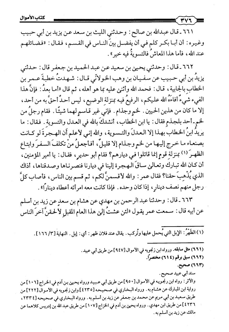 قَالَ أَبُو عُبَيْدٍ: وَقَدْ كَانَ رَايُ عُمَرَ الْأَوَّلُ التَّفْضِيلُ عَلَى السَّوَابِقِ وَالْغَنَاءِ عَنِ الْإِسْلَامِ، وَهَذَا هُوَ الْمَشْهُورُ مِنْ رَايِهِ، وَكَانَ رَايُ أَبِي بَكْرٍ التَّسْوِيَةَ، ثُمَّ قَدْ جَاءَ عَنْ عُمَرَ شَيْءٌ شَبِيهٌ بِالرُّجُوعِ إِلَى رَايِ أَبِي بَكْرٍ، وَكَذَلِكَ يُرْوَى عَنْ عَلِيٍّ التَّسْوِيَةُ أَيْضًا وَلِكِلَا الْوَجْهَيْنِ مَذْهَبٌ.