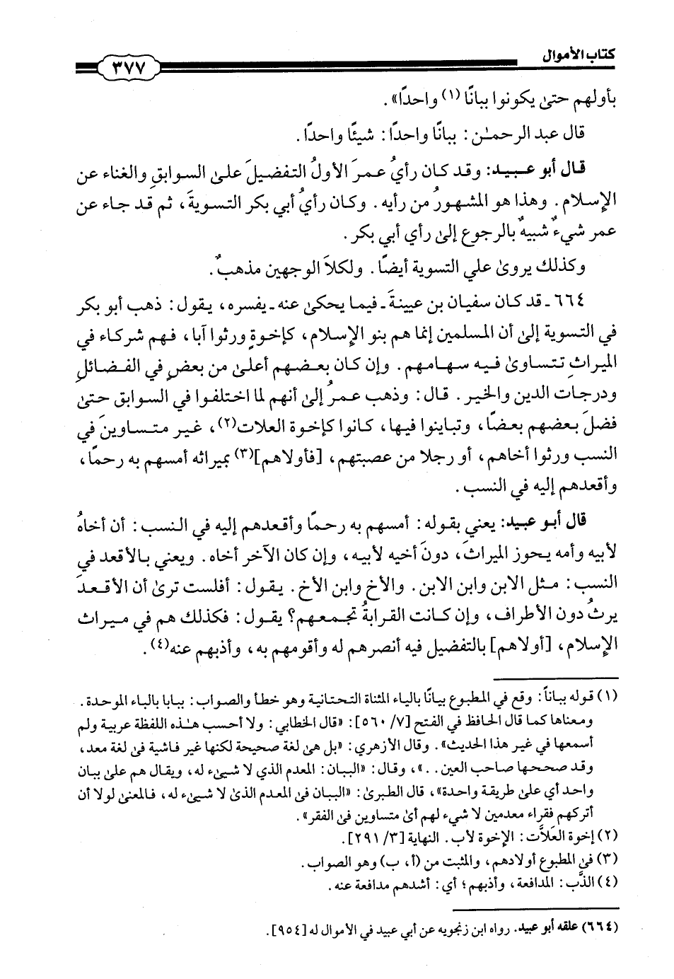 664 - (652) قَدْ كَانَ سُفْيَانُ بْنُ عُيَيْنَةَ فِيمَا يُحْكَى عَنْهُ يُفَسِّرُهُ، يَقُولُ: ذَهَبَ أَبُو بَكْرٍ فِي التَّسْوِيَةِ إِلَى أَنَّ الْمُسْلِمِينَ إِنَّمَا هُمْ بَنُو الْإِسْلَامِ، كَإِخْوَةٍ وَرِثُوا آبَاءَهُمْ، فَهُمْ شُرَكَاءُ فِي الْمِيرَاثِ تَتَسَاوَى فِيهِ سِهَامُهُمْ، وَإِنْ كَانَ بَعْضُهُمْ أَعْلَى مِنْ بَعْضٍ فِي الْفَضَائِلِ، وَدَرَجَاتِ الدِّينِ وَالْخَيْرِ، قَالَ: وَذَهَبَ عُمَرُ إِلَى أَنَّهُمْ لَمَّا اخْتَلَفُوا فِي السَّوَابِقِ حَتَّى فَضَلَ بَعْضُهُمْ بَعْضًا، وَتَبَايِنُوا فِيهَا، كَانُوا كَإِخْوَةِ الْعَلَّاتِ، غَيْرَ مُتَسَاوِينَ فِي النَّسَبِ وَرِثُوا أَخَاهُمْ، أَوْ رَجُلًا مِنْ عَصَبَتِهِمْ، فَأَوْلَاهُمْ بِمِيرَاثِهِ أَمَسُّهُمْ بِهِ رَحِمًا وَأَقْعَدُهُمْ إِلَيْهِ فِي النَّسَبِ.